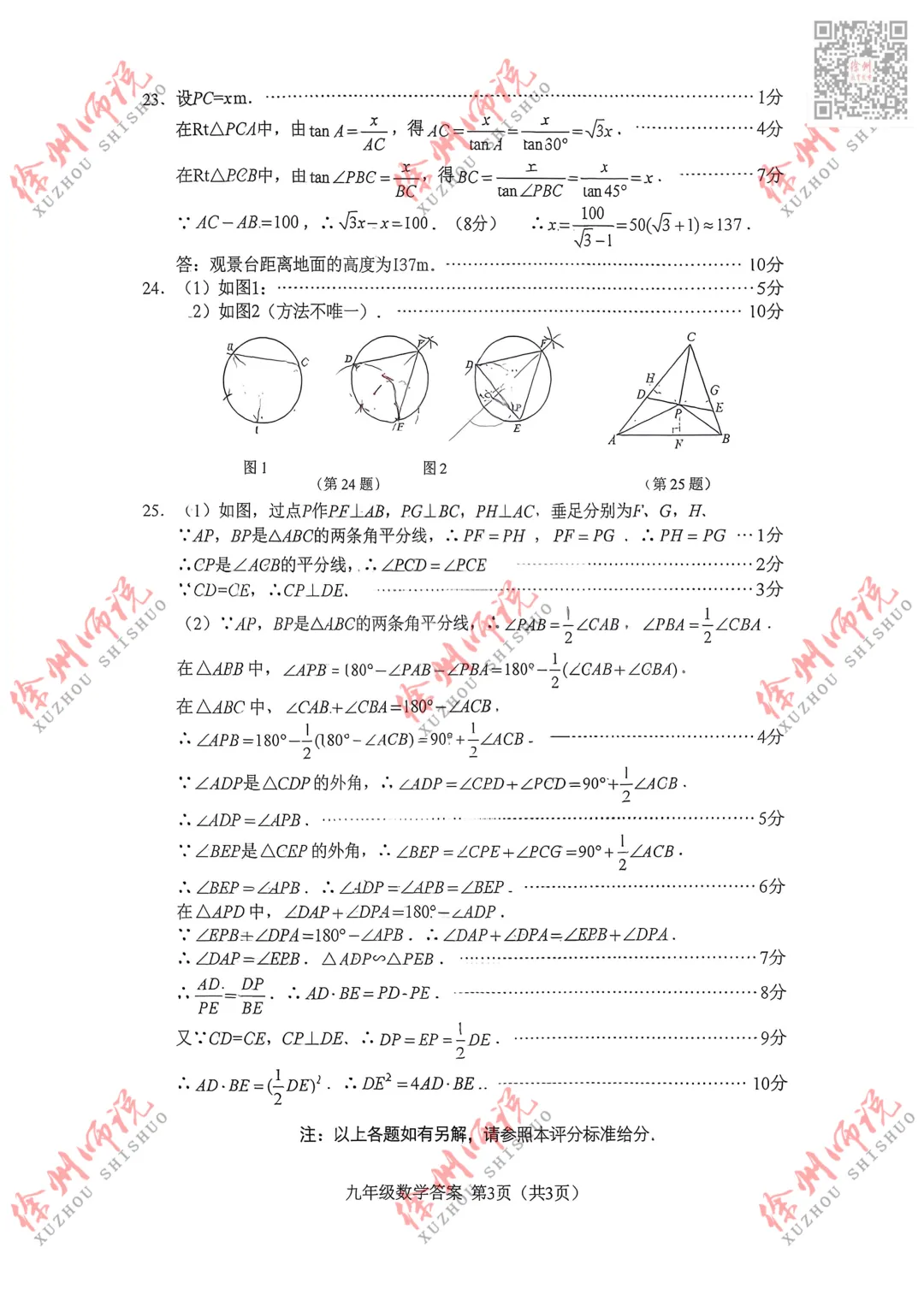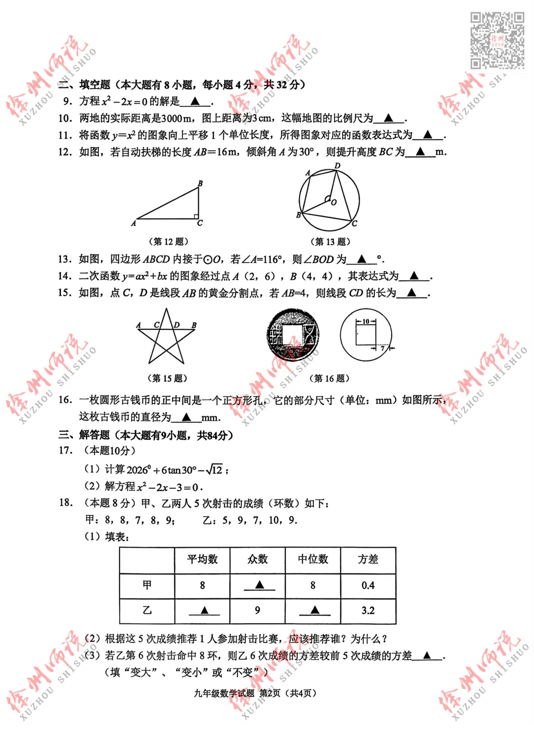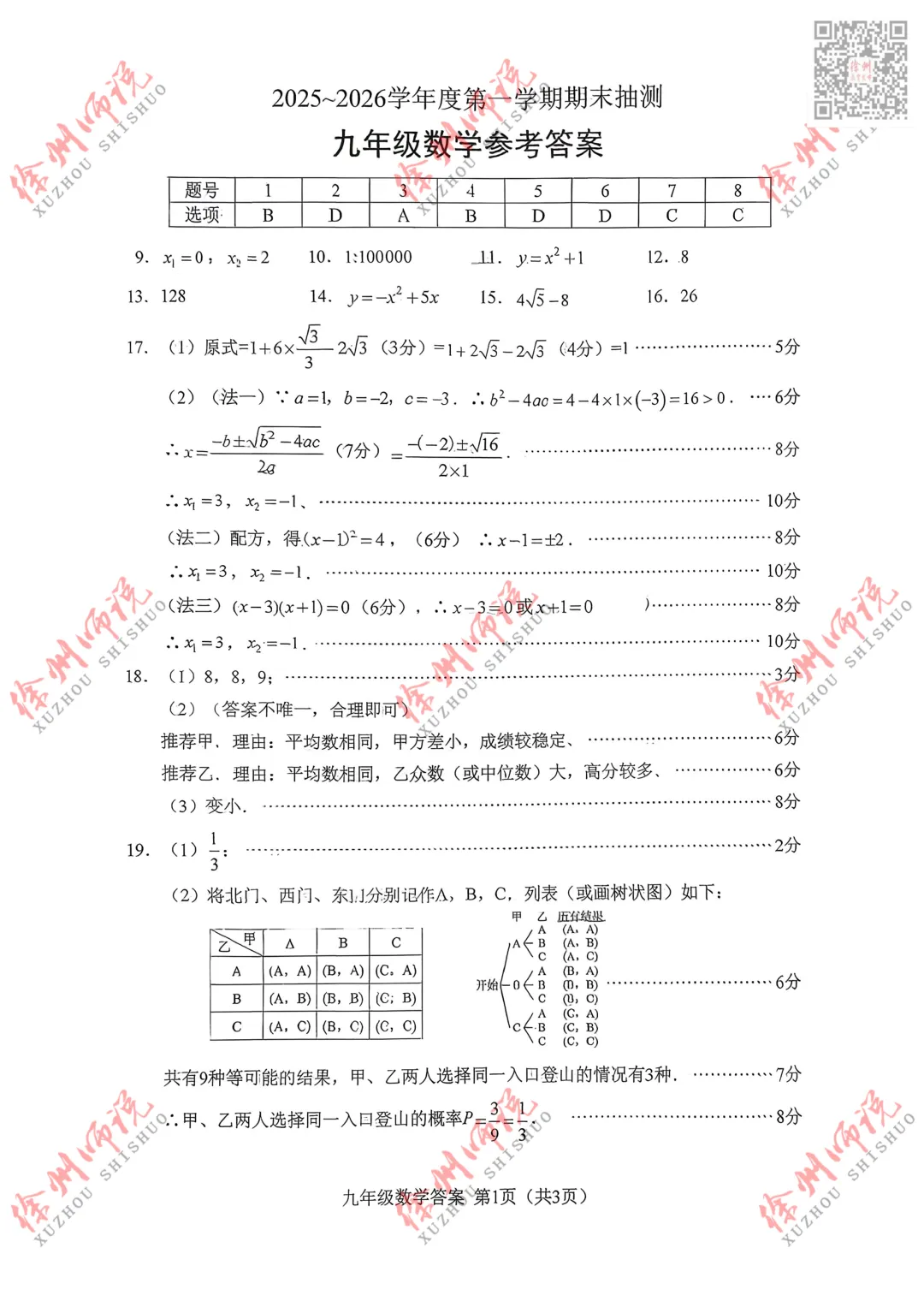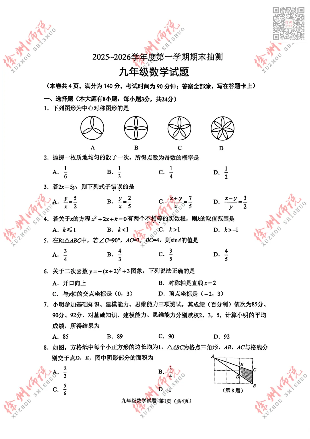 >真题来袭!徐州九年级2025-2026学年度第一学期期末数学真题+答案