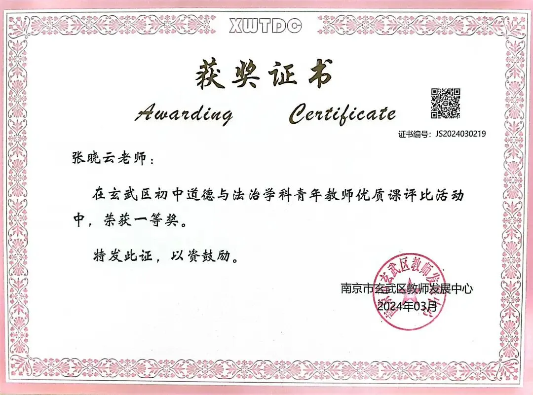 张晓云,硕士研究生,现任我校团委书记,道德与法治专任教师。作为校团委书记,曾获“玄武区优秀共青团干部”“玄武区教育工作突出贡献奖”等荣誉。她扎实开展团务工作,强化思想引领,注重德育实践,积极拓展校外资源服务青年成长。在专业发展上,她勤于学习反思,曾获“第十届玄武区优秀青年教师”,江苏省“五四杯”微课二等奖、区教学先进个人等多项教学荣誉。多次担任“冬训主讲人”,均在学习强国平台上发布,被中共玄武区委教育工委评为“冬训优秀主讲人”。其撰写的论文、案例多次获市、区级奖项,并积极参与省、市课题研究,开设区级公开课与讲座,展现了全面的育人能力与专业素养。