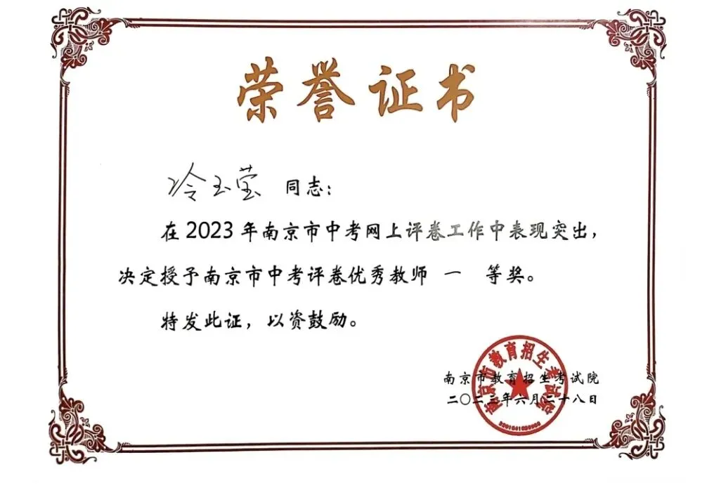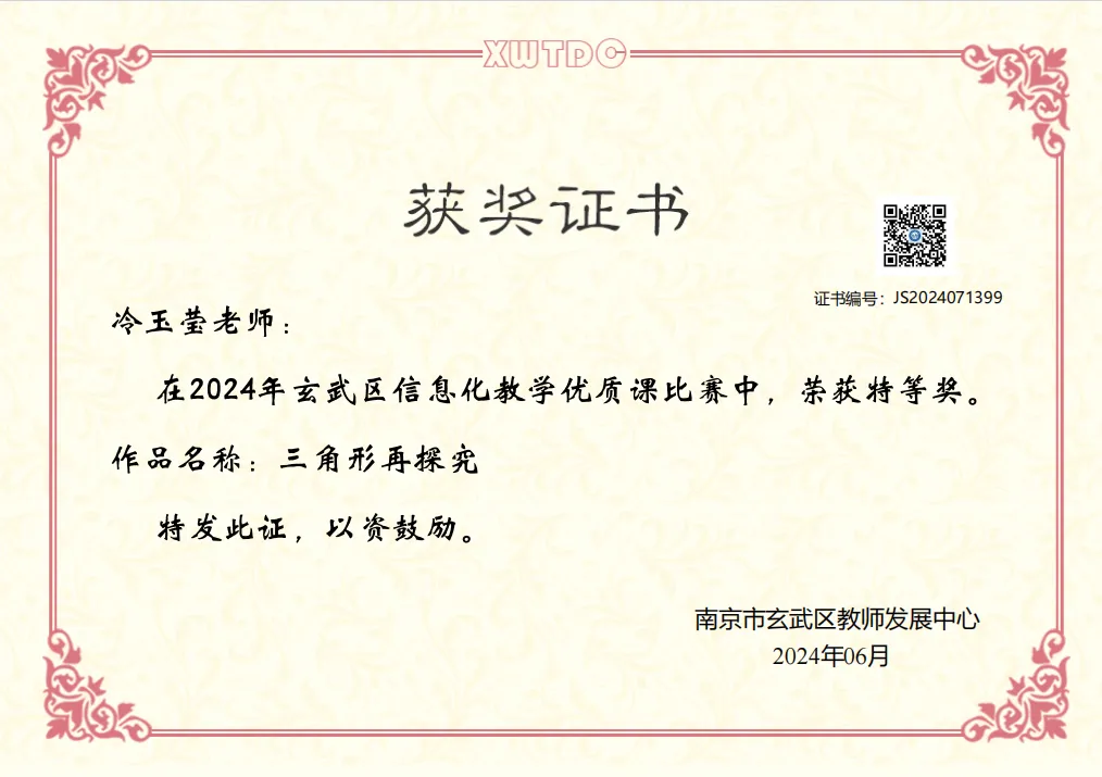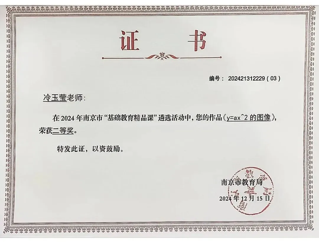 冷玉莹老师,硕士研究生,区初中数学学科中心组成员,区优秀青年教师,多次开设省、市、区级讲座和公开课,主持两项市级课题,参加多项省市级课题,多篇论文获市区级奖项。曾获玄武区教学先进个人、玄武区教育工作突出贡献奖、孝陵卫街道“钟山好教师”、南京市中考优秀评卷教师一等奖、玄武区信息化教学比赛特等奖、玄武区教师基本功比赛一等奖、玄武区青年教师优秀课一等奖、玄武区初三教师解题命题能力比赛一等奖、玄武区微课比赛一等奖、玄武区作业设计比赛一等奖等多项荣誉奖项。