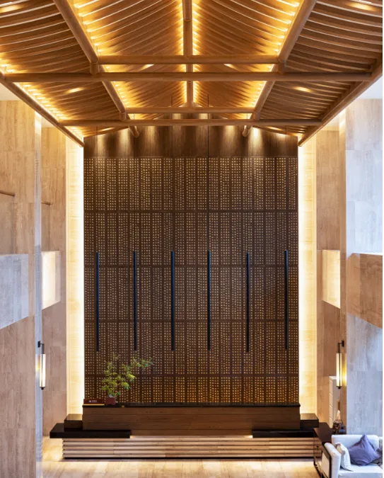 酒店占地约25000多平,由多栋中式风韵建筑组成,楼高不过3层,与自然风光的匹配度甚高。户外中式园林葱郁而茂密,穿行其中,便能感受到四季更迭的美。