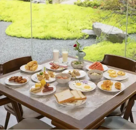 酒店餐厅融合东方禅意风格的枫云,空间宽阔,没有繁杂多余的摆设,超大落地窗引景入室,大自然的风物尽收眼底,木水禅心,融于一方之间,满目皆是舒适。