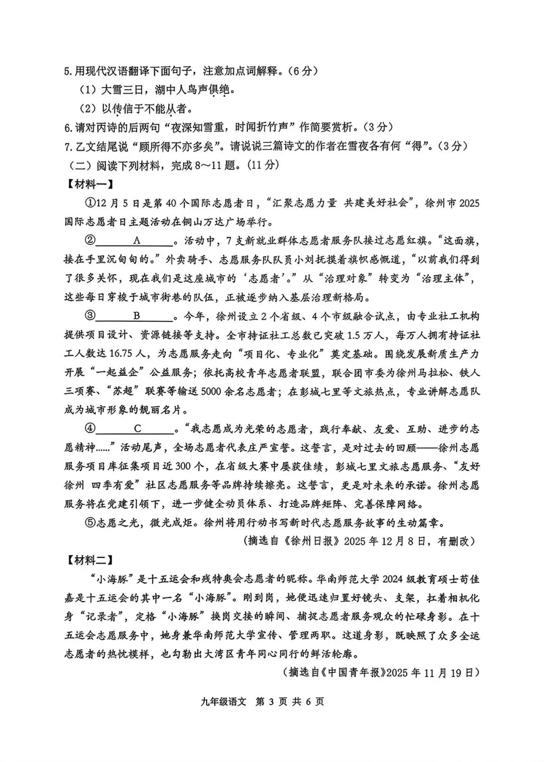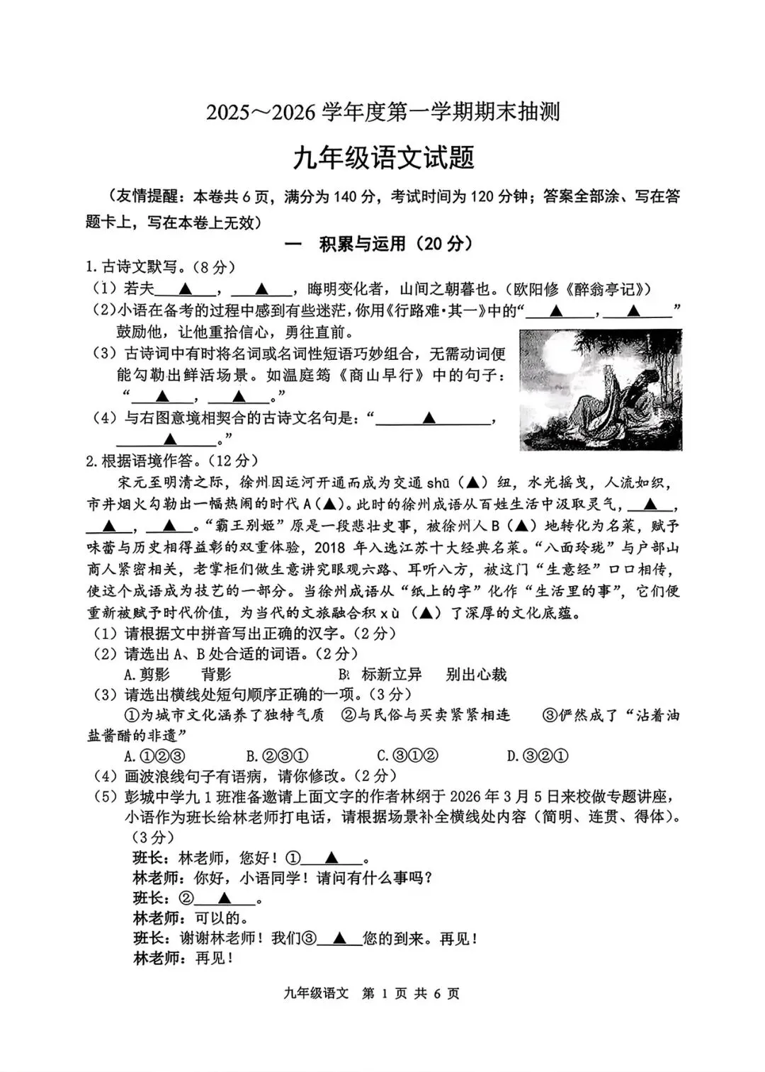江苏省徐州市2025—2026学年度第一学期期末抽测九年级语文试题
