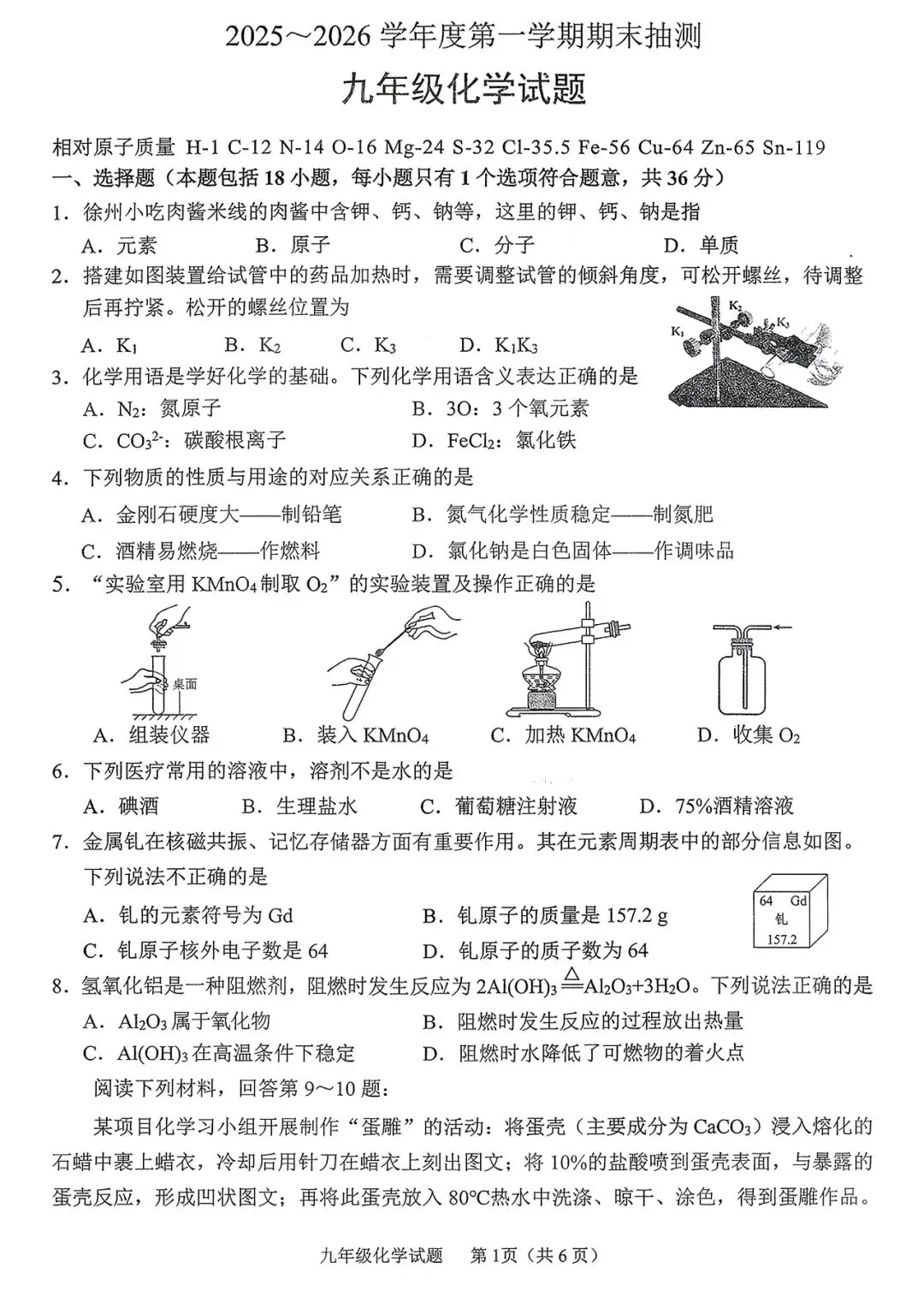 江苏省徐州市2025—2026学年度第一学期期末抽测九年级化学试题
