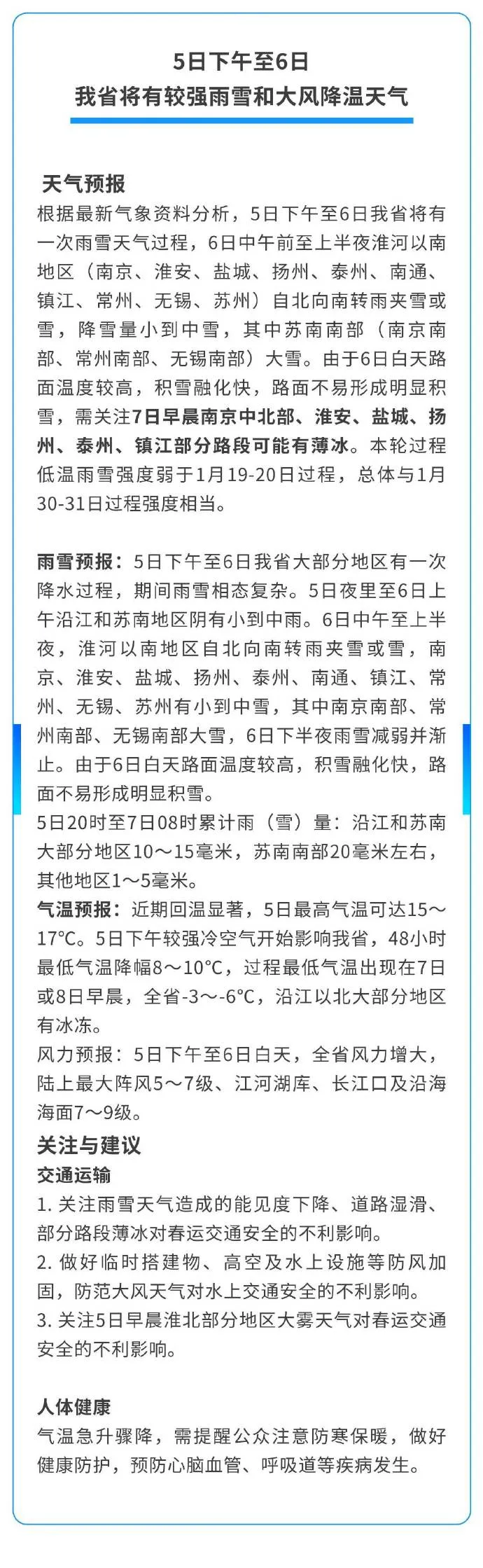 据江苏气象,根据最新气象资料分析,5日下午至6日江苏将有一次雨雪天气过程,6日中午前至上半夜淮河以南地区(南京、淮安、盐城、扬州、泰州、南通、镇江、常州、无锡、苏州)自北向南转雨夹雪或雪,降雪量小到中雪,其中苏南南部(南京南部、常州南部、无锡南部)大雪。
