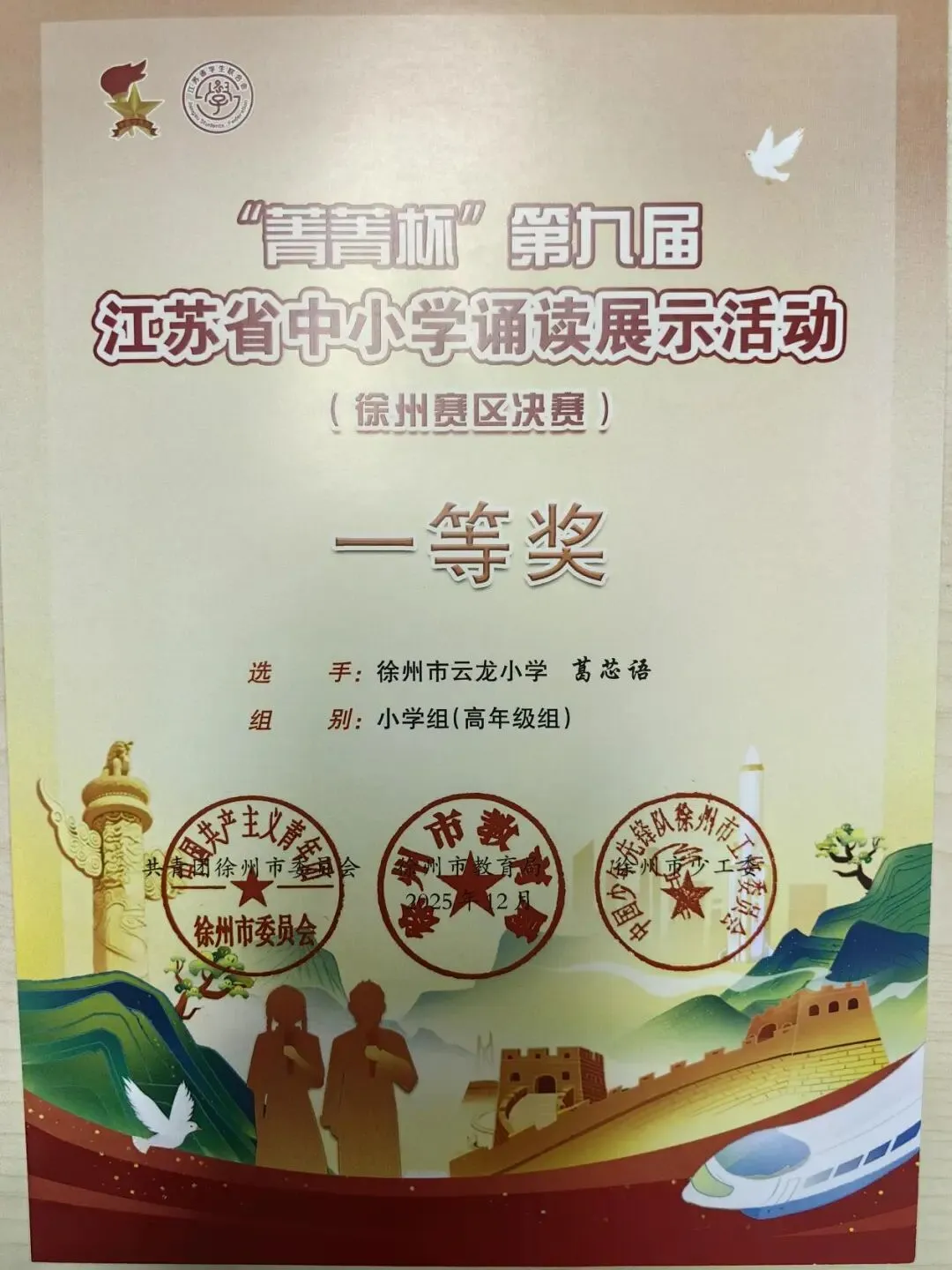 我校学生葛芯语荣获“菁菁杯”第九届江苏省中小学诵读展示活动小学组(高年级组) 一等奖;