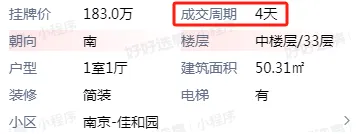雨花台外国语小学南站校区+雨花台中学南站校区的万科尚都荟1个月成交了6套二手房,其中12月7号一天就成交了2套二手房,并且成交周期都很短,4天、5天、6天、36天...都是刚挂不久就被拍下!科睿小学+金陵汇文中学双学区的佳和园,总价200万左右,近期成交8套房源,成交周期最快只要1天,一点不拖泥带水。