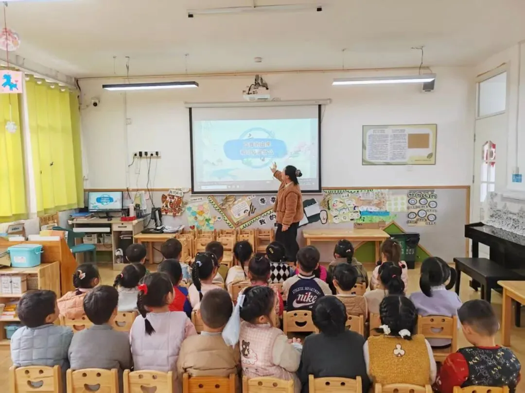 中班的教室里传来了清甜的歌声,宝贝们正用一首《听我说》歌唱春天。他们摇晃着小身体,跟着旋律拍手、点头,稚嫩的童声里满是对春日的喜爱与憧憬。