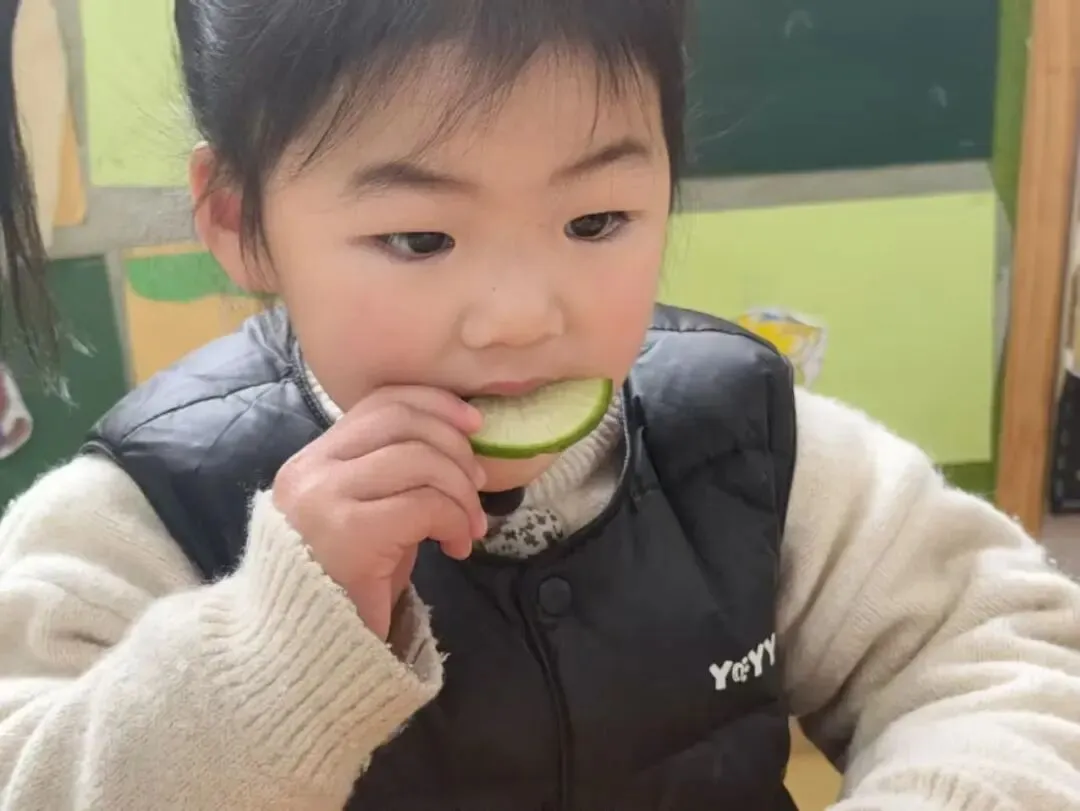 咬春”是立春的传统习俗,小一班的课堂上,老师正绘声绘色地讲解着咬春的故事与习俗。清脆的萝卜片成了孩子们的“春日法宝”,有的宝贝小心翼翼地咬下一口,感受着萝卜的清甜爽脆;有的宝贝把萝卜片当成“小镜子”,透过圆圆的孔洞看世界,一张张笑脸在翠绿的萝卜圈后绽放,一口口“咬”下的,不仅是美味,更是对春天的期待呀!