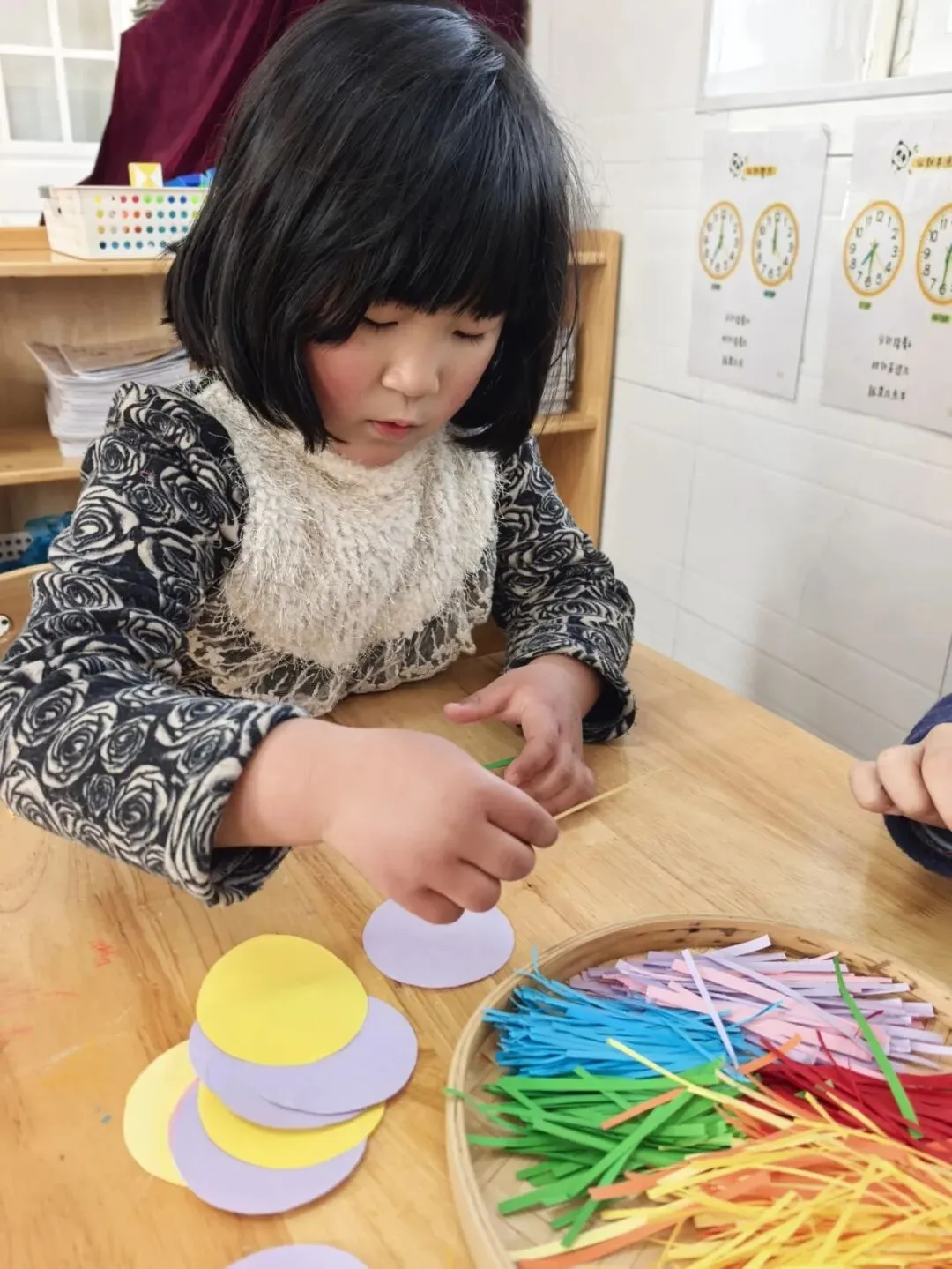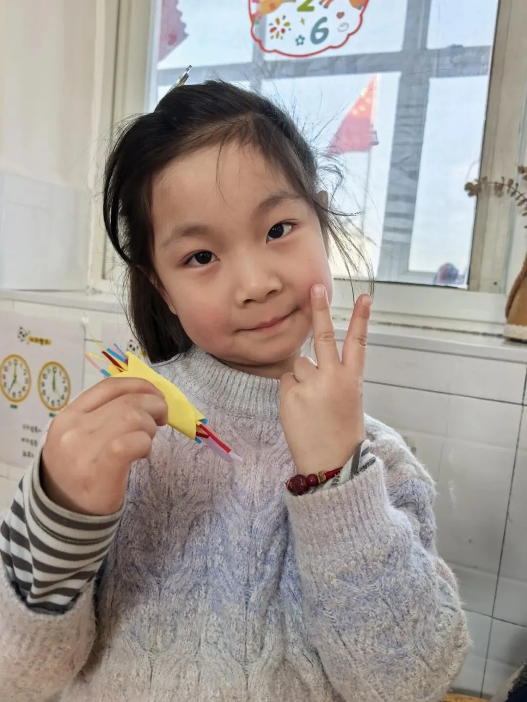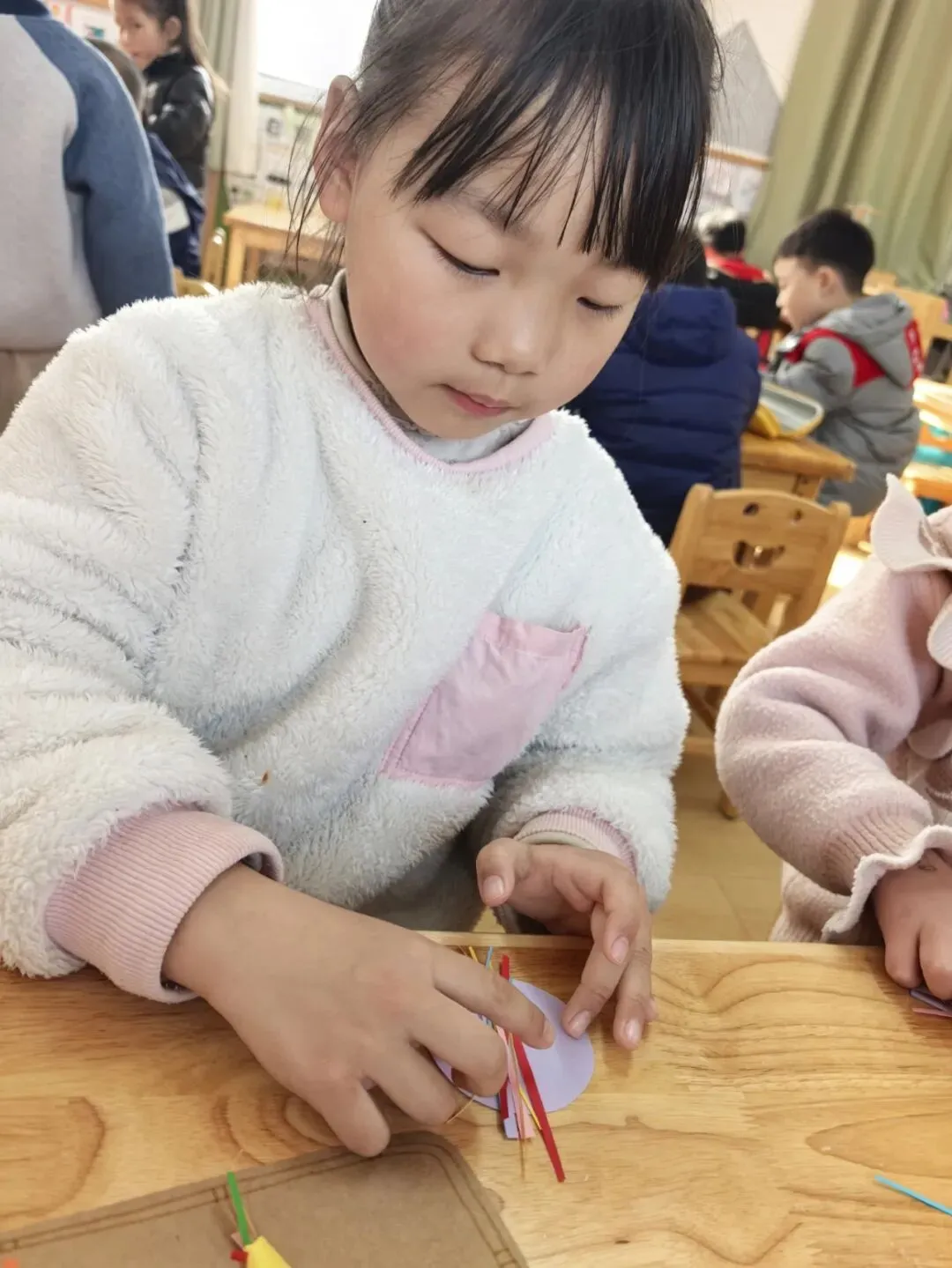 大一班的教室里,彩纸、胶棒、彩色纸条整齐摆放,一场“创意春卷DIY”正在进行!孩子们化身小小美食家,专注地挑选着五彩纸条,认真地折叠、粘贴,用稚嫩的小手将“春日美好”层层包裹。不一会儿,一个个色彩鲜艳、造型可爱的“手工春卷”就诞生啦,宝贝们举着自己的作品比出“耶”,指尖的温度,就是春天最暖的模样。