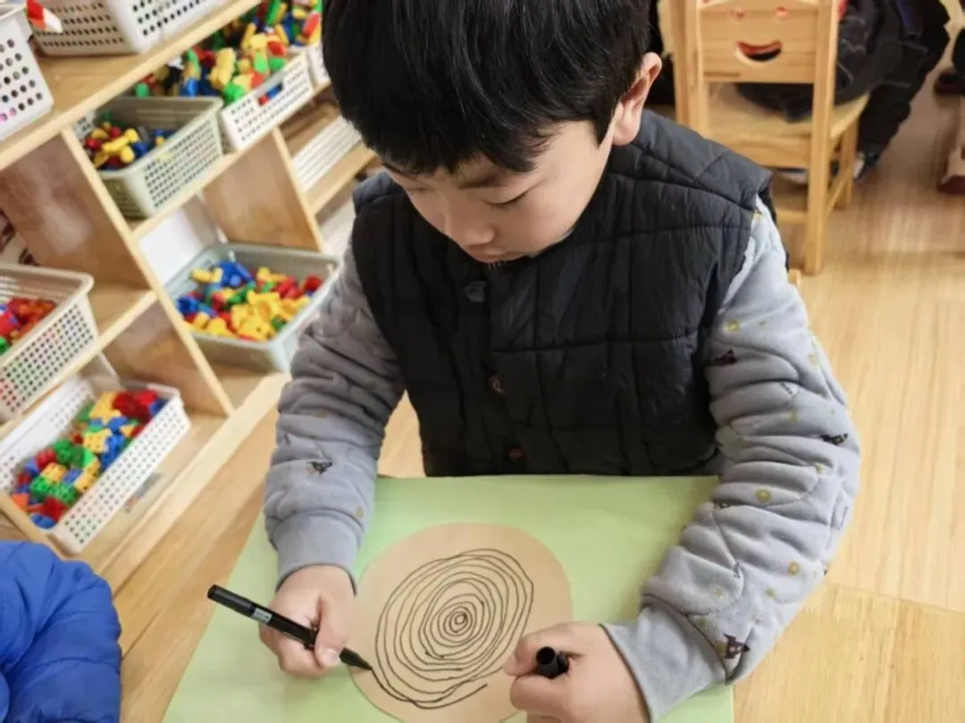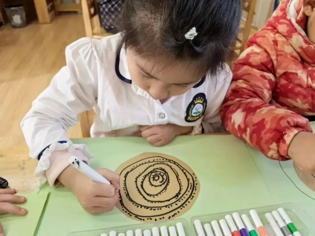 大二班的孩子们则用画笔开启了“春日创作”,牛皮纸、马克笔在他们手中变成了描绘春天的魔法工具。宝贝们低头专注地勾勒线条,一圈圈灵动的纹路在纸上蔓延,像是春日里生长的年轮,又像是绽放的春日繁花,每一笔都是童心对春天最浪漫的想象。