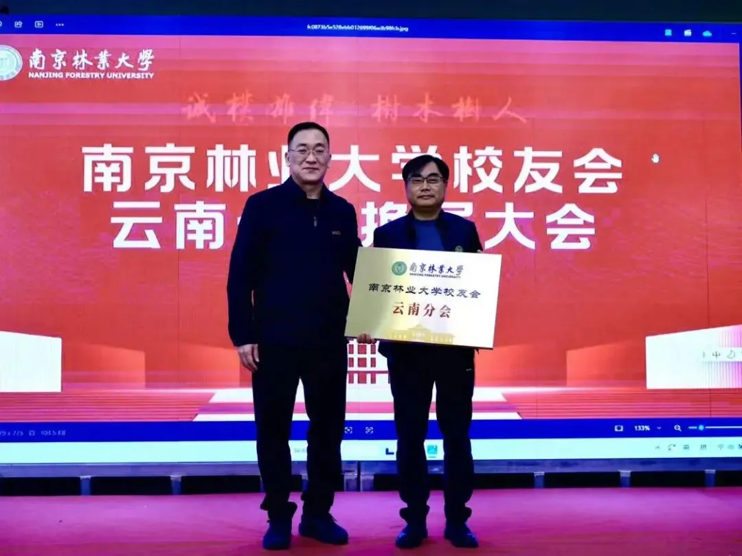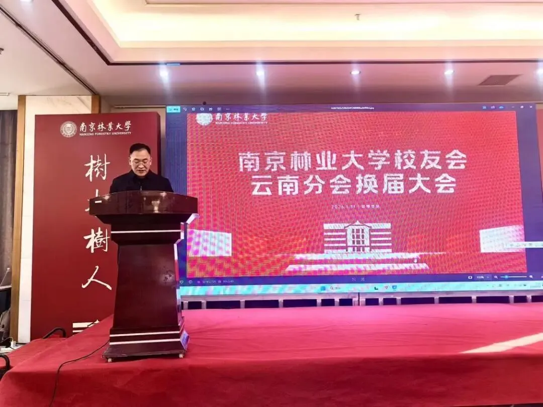 1月31日,南京林业大学校友会云南分会换届大会在昆明举行。大会现场,播放了校长勇强为大会录制的祝福视频。副校长聂永江出席会议并讲话,校友工作办公室主任刘子超、学生工作部(处)部长周纯、淮安校区管委会常务副主任黄学明、艺术设计学院、家居工业与设计学院党委书记陶文娟、材料科学与工程学院原党委书记石德兴、高等教育研究所副所长李鸣明等参加了活动,来自重庆、浙江、四川、贵州、广西、新疆、宁波、苏州、淮安等地校友分会代表,北京大学、哈尔滨工业大学、华中科技大学等高校云南校友会代表,和近百位在滇校友代表齐聚一堂,共叙同窗情谊,共商发展大计,携手共创,为云南校友分会发展开启全新篇章。