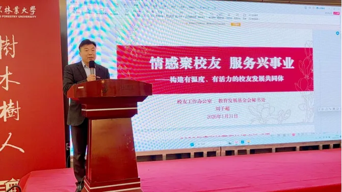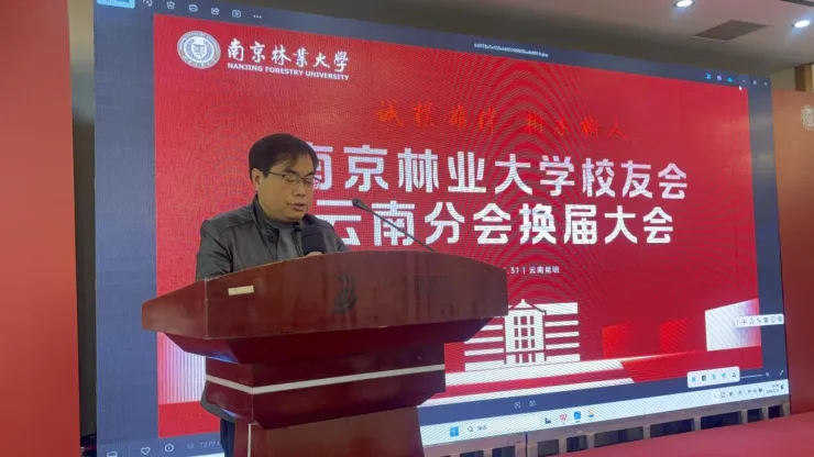 刘子超在会上宣读《关于同意南京林业大学校友会云南分会换届的函复》,并作了《情感聚校友,服务兴事业——构建有温度、有活力的校友发展共同体》专题报告,系统阐述了以情感为纽带、服务为载体,构建校友与母校双向赋能发展生态的理念与实践路径。