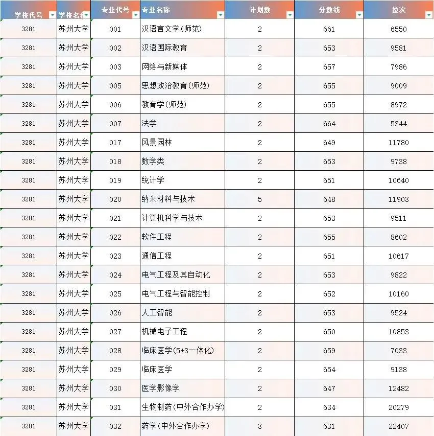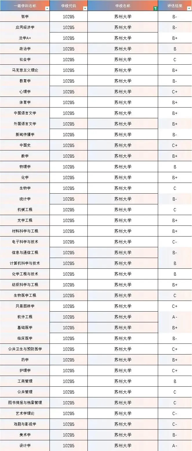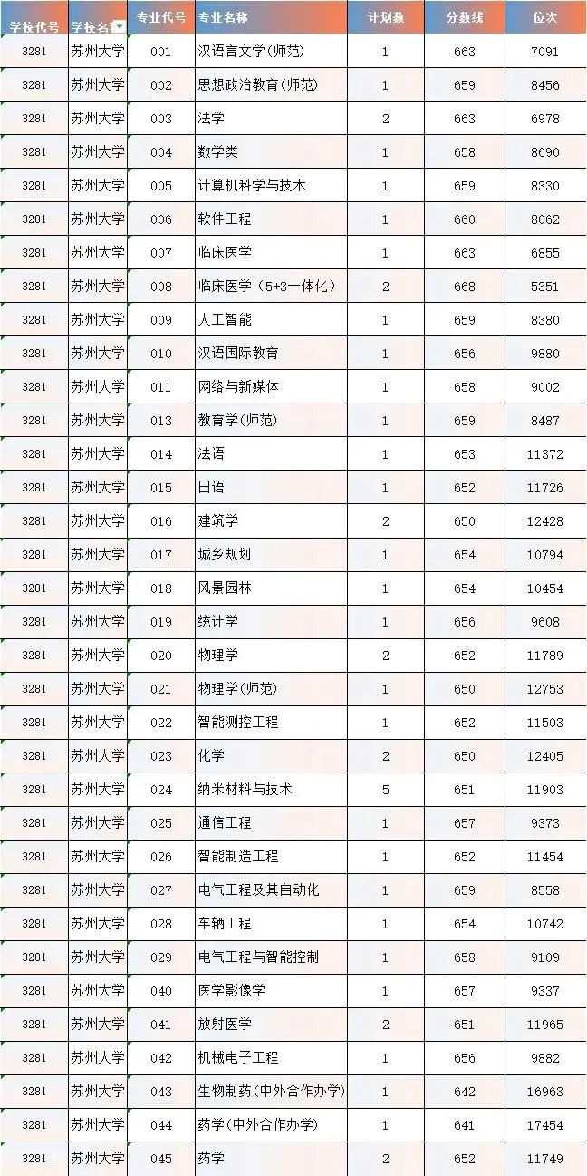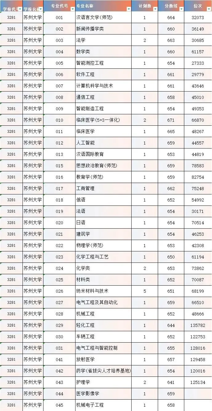 苏州大学现有哲学、经济学、法学、教育学、文学、历史学、理学、工学、农学、医学、管理学、艺术学、交叉学科等十三大学科门类。学校设有37个学院(部),拥有全日制本科生27671人,硕士生18506人,博士生2239人,国际学生1523人。学校现设132个本科专业,33个博士学位授权一级学科点,3个博士专业学位授权点,49个硕士学位授权一级学科点,35个硕士专业学位授权点,30个博士后流动站;学校现有1个国家一流学科,22个江苏高校优势学科, 6个“十四五”江苏省重点学科。截至目前,学校化学、材料科学、临床医学、物理学、工程学、生物学与生物化学、药理学与毒理学、神经科学与行为学、分子生物与遗传学、免疫学、数学、计算机科学、农业科学、环境科学与生态学、一般社会科学、综合交叉学科、精神病学与心理学、微生物学、植物学与动物学共19个学科进入全球基本科学指标(ESI)前1%,其中,化学、材料科学、临床医学、药理学与毒理学、工程学5个学科进入全球基本科学指标(ESI)前1‰。