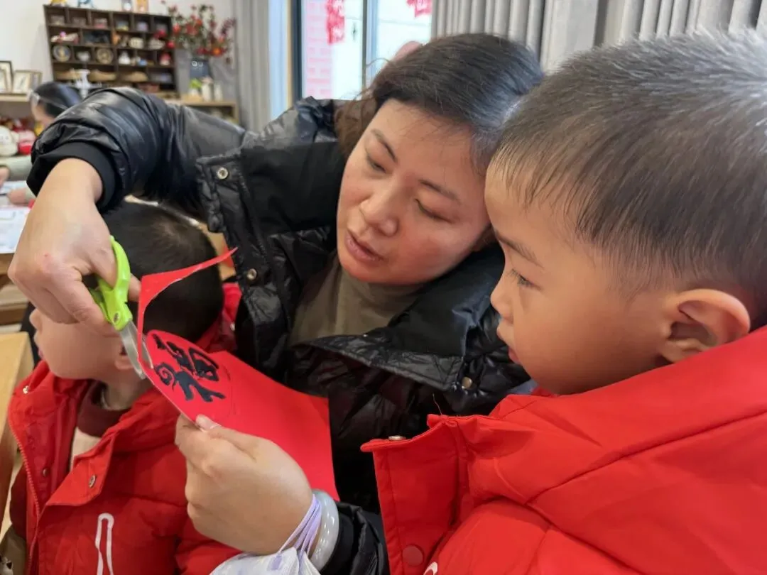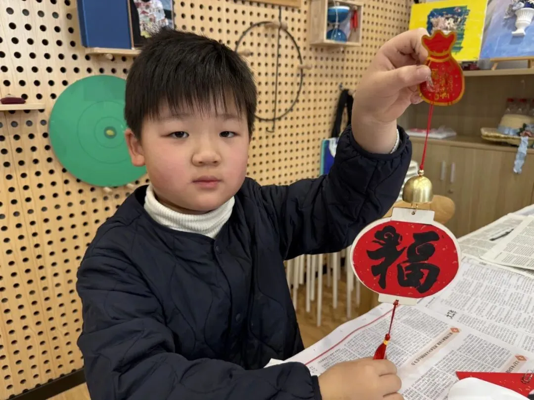 普法讲座结束后,活动进入了轻松愉悦的“巧手迎新春”手工环节。在工作人员的指导下,家长和孩子们共同动手,体验传统“福”字风铃拓印的乐趣。一双双大手握着小手,一起调制色彩、铺展纸张、细心拓印。活动现场,孩子们兴奋地展示自己的作品,家长们则耐心协助,鼓励创意。不一会儿,一个个蕴含着美好寓意、独具匠心的“福”字风铃便陆续完成。清脆的风铃声中,交织着孩子的欢笑与家长的赞许,亲子间的情感在共同创作中悄然升温,温馨幸福的年味弥漫在整个教室。