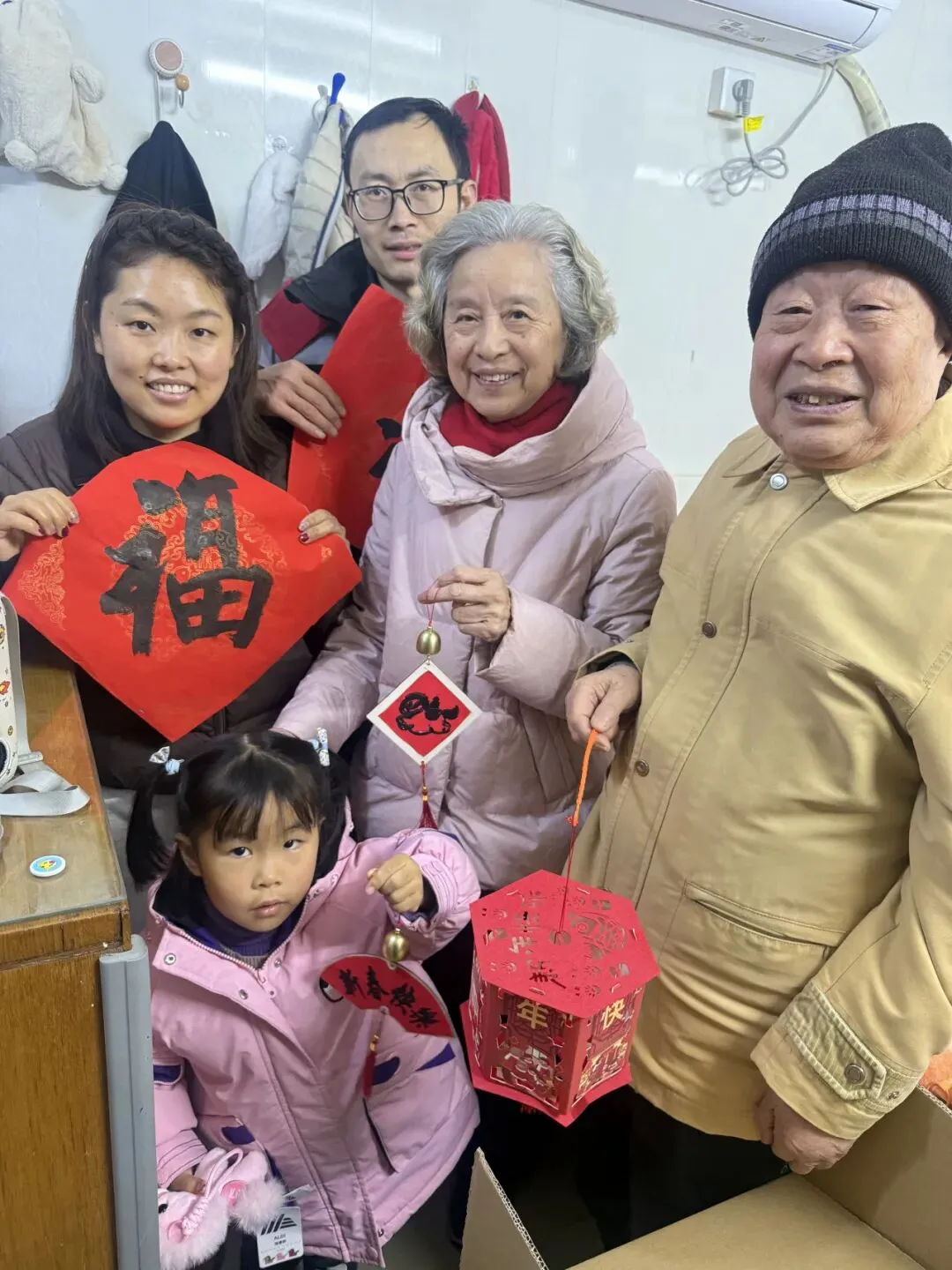 活动结束后,“五老”代表怀着对下一代的深切关爱,将这份温暖从活动现场延伸至社区。他们带着新鲜制作完成、充满童真童趣的手工作品以及象征吉祥如意的新年“福”字,走进部分社区亲子家庭,尤其是社区新就业群体亲子儿童家庭。“五老”代表与家长、孩子亲切交谈,关切询问孩子们的生活学习情况,并将承载着祝福的手工作品和“福”字送到他们手中,提前送上诚挚的新春问候。这份“上门”的祝福,不仅传递了节日的喜庆,更体现了社区对下一代成长的持续关注与用心呵护。