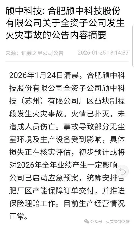免责声明:文章归作者所有,转载仅为分享和学习使用,不做其他商业用途!内容如有侵权,请联系本部删除!(手机微信同号15150147049)2026年1月25日,颀中科技(688352)发布公告,通报关于全资子公司颀中科技(苏州)有限公司发生火灾事故的情况。