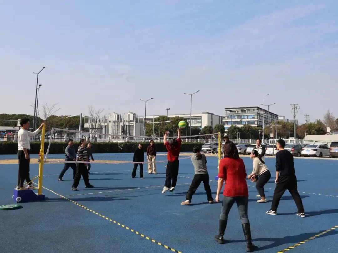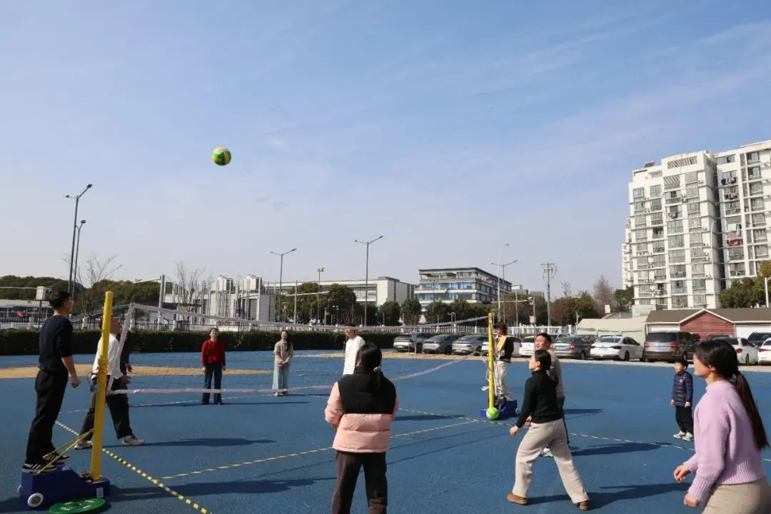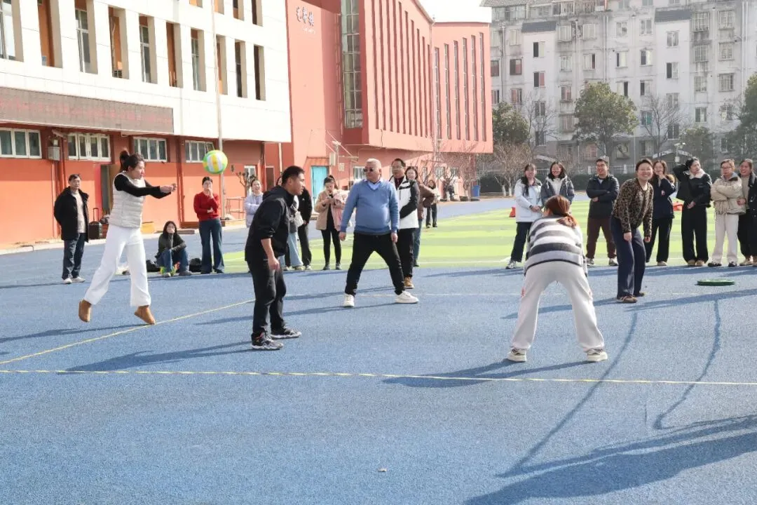 套大鹅环节趣味拉满,全场沉浸在轻松欢乐的氛围中。老师们手持彩圈,瞄准目标精准投掷,每一次命中都引来满堂喝彩,每一次尝试都伴随善意欢笑。同事们相互支招、并肩鼓劲,分享技巧、传递好运,在欢声笑语中拉近彼此距离,以轻松愉悦的方式凝聚团队温情,让团结之花在趣味赛场尽情绽放!气排球赛场高潮迭起,排球凌空飞跃,点燃全员拼搏热情。各代表队默契配合,攻防有序。发球、垫球、扣杀一气呵成,矫健身姿尽显活力。赛场边,助威声一浪高过一浪,队员们彼此鼓励,补位协作,在竞技中增进情谊,在协作中锤炼意志,用汗水与欢笑书写团结篇章,彰显长江小学教职工奋勇争先、凝心聚力的卓越风采。