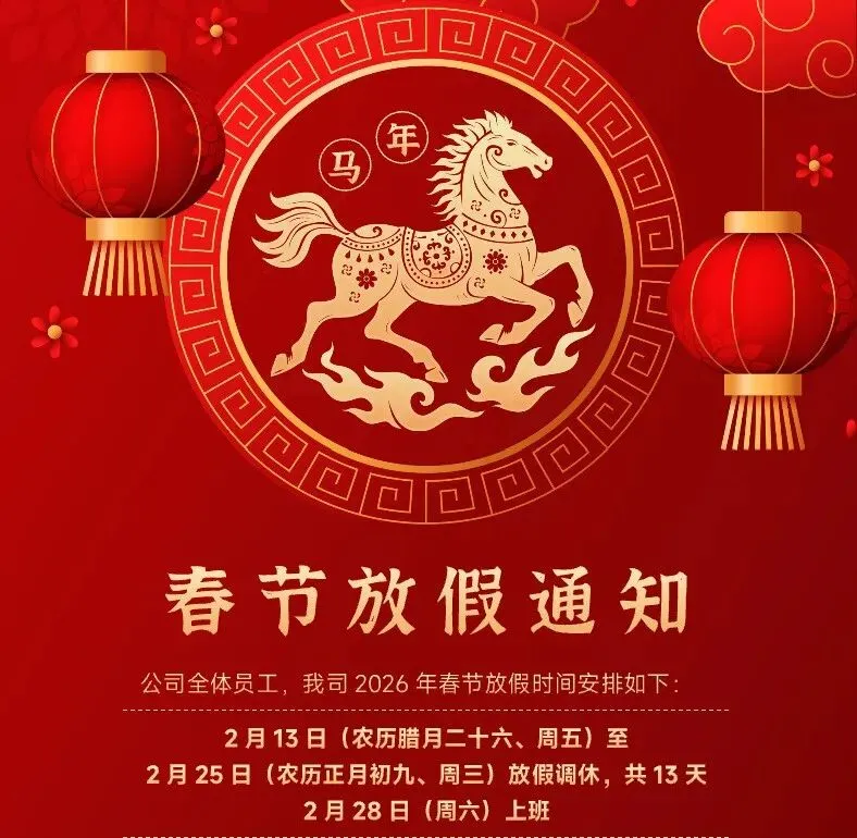 随着骏马嘶鸣踏春而来,我们即将迎来充满希望的2026农历新年!在这辞旧迎新的美好时刻,苏州探研衷心感谢每一位伙伴的辛勤付出。现将春节假期安排温馨告知: