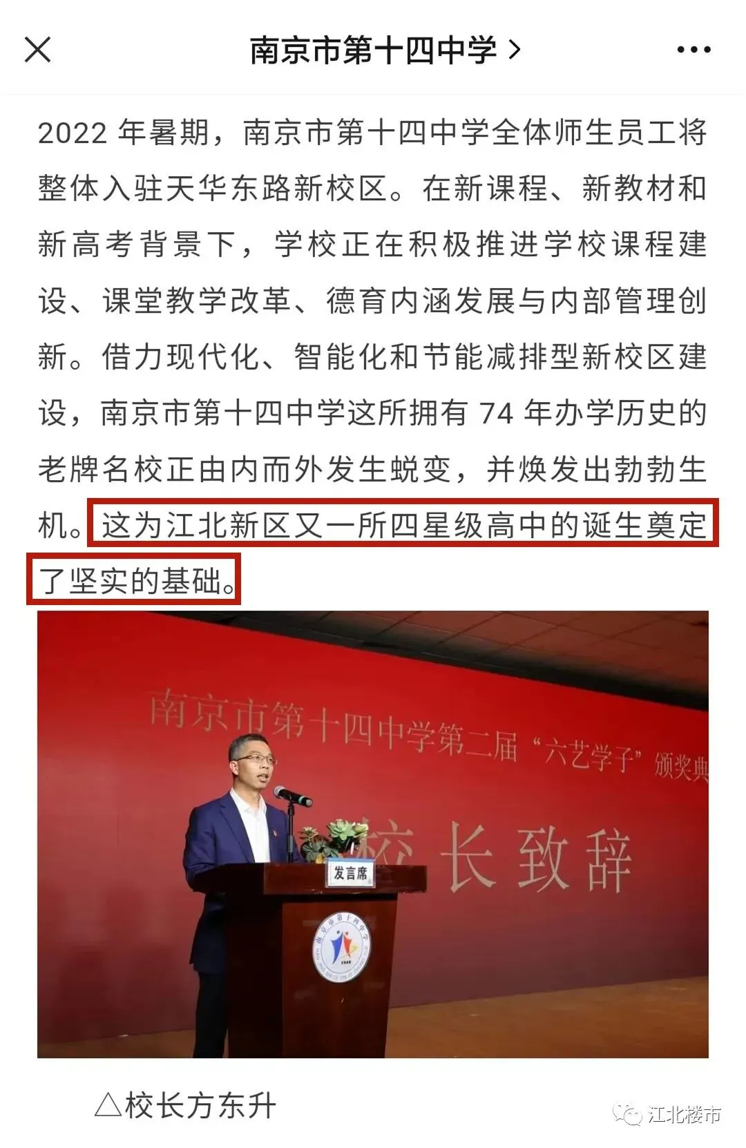 2022年暑期,南京市第十四中学整体搬迁入驻位于沿江街道民兵路的新校区,原校址给了江北新城高级中学。学校的整体搬迁,为江北新区又一座四星级高中的诞生奠定了坚实的基础。