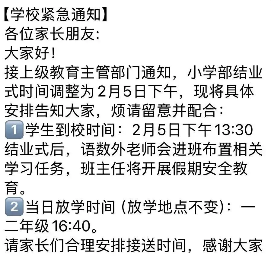 重要通知:您好,尊敬的家长!因天气预报周五有雨雪,为保障孩子安全,经研究,2月5日上午8:00学生到校,一到三年级9:50放学,四到六年级10:00放学。本学期于2月5号结束。请提前祝您全家新年快乐,马年大吉!某小学通知提前返校