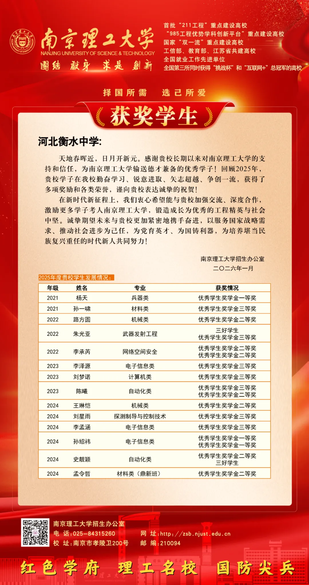 南京理工大学在喜报中充分肯定我校育人成效,感谢我校持续为其输送品学兼优、可堪大用的栋梁之才,字里行间满是对两校育人共识的深切认同。
