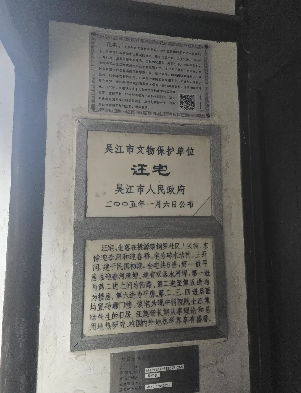 去了汪宅看了一圈,这里是吴江市文物保护单位,门口还有一个石板桥,很低调,进不去的我,只能看看门头和建筑外观。这里是民国时候的建筑,共有六进,这里是中国科学院院士汪集旸老宅子,在门口还有牌子会介绍一下他的生平的荣誉。汪集旸是世界第一人将地质与地球物理紧密结合,将我国大陆岩石圈热结构划分出五种类型,感兴趣的可以了解一下,他算是铜罗的名士!能进去的话,还能看见砖雕门楼和石板天井。