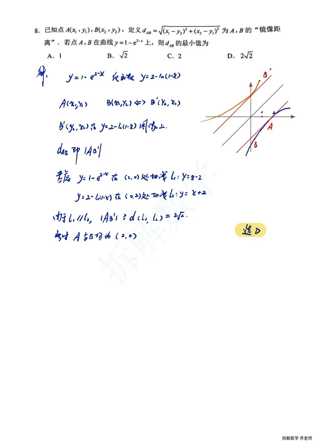 第8题,此题以新定义的外壳考查距离,从定义来看,可以发现其公式与距离公式的区别只在第二个点的横纵坐标对调,马上能想到反函数的特点,转化为两反函数上任意点之间的距离即可,此时就需要较强的观察力,注意到两特殊点的切线刚好与对称轴平行,其距离刚好就是最小值。
