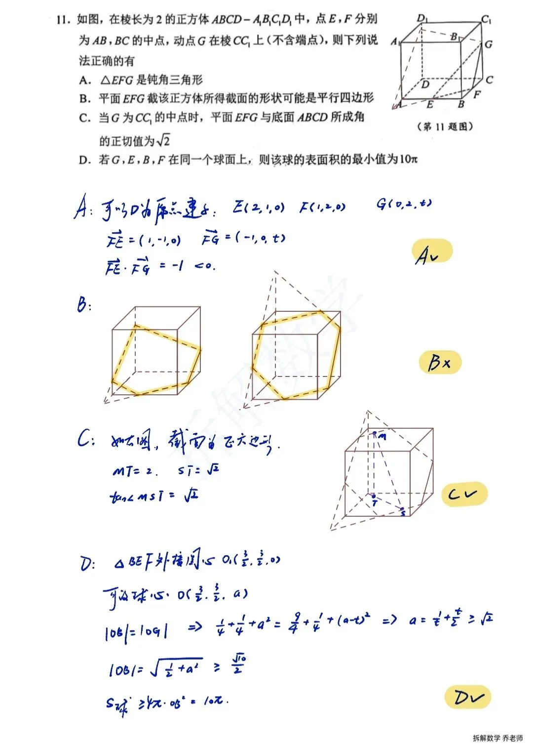 第11题,一道很经典的截面问题,综合性很强,但难度不算太大,即便是D选项也是比较轻松。此类问题处理核心还得是如何准确画出截面。