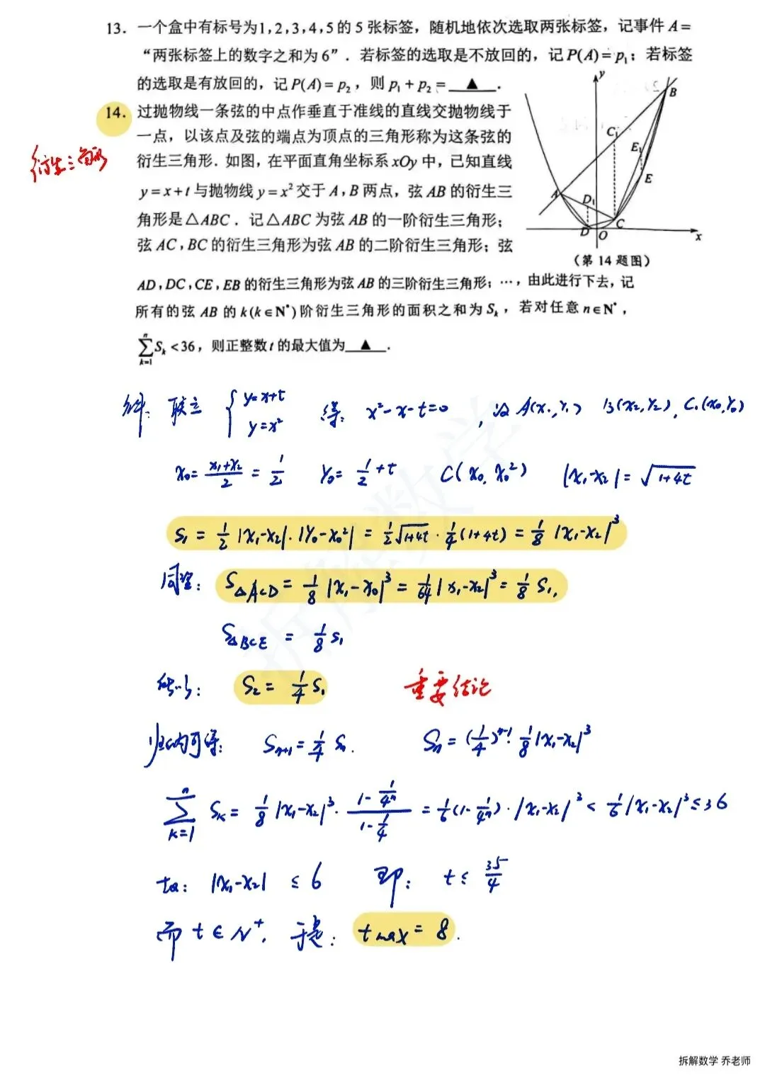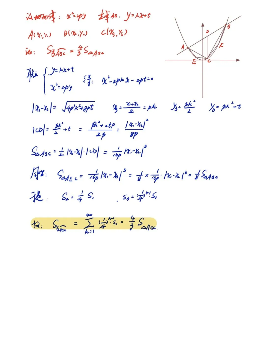 第14题,非常经典的问题,用这种分割的思路实际上可以算出抛物线任意弓形的面积,刚好等于所有衍生三角形面积之和,即第一个三角形面积的4/3,实用性很强的一种求抛物线弓形面积的做法。