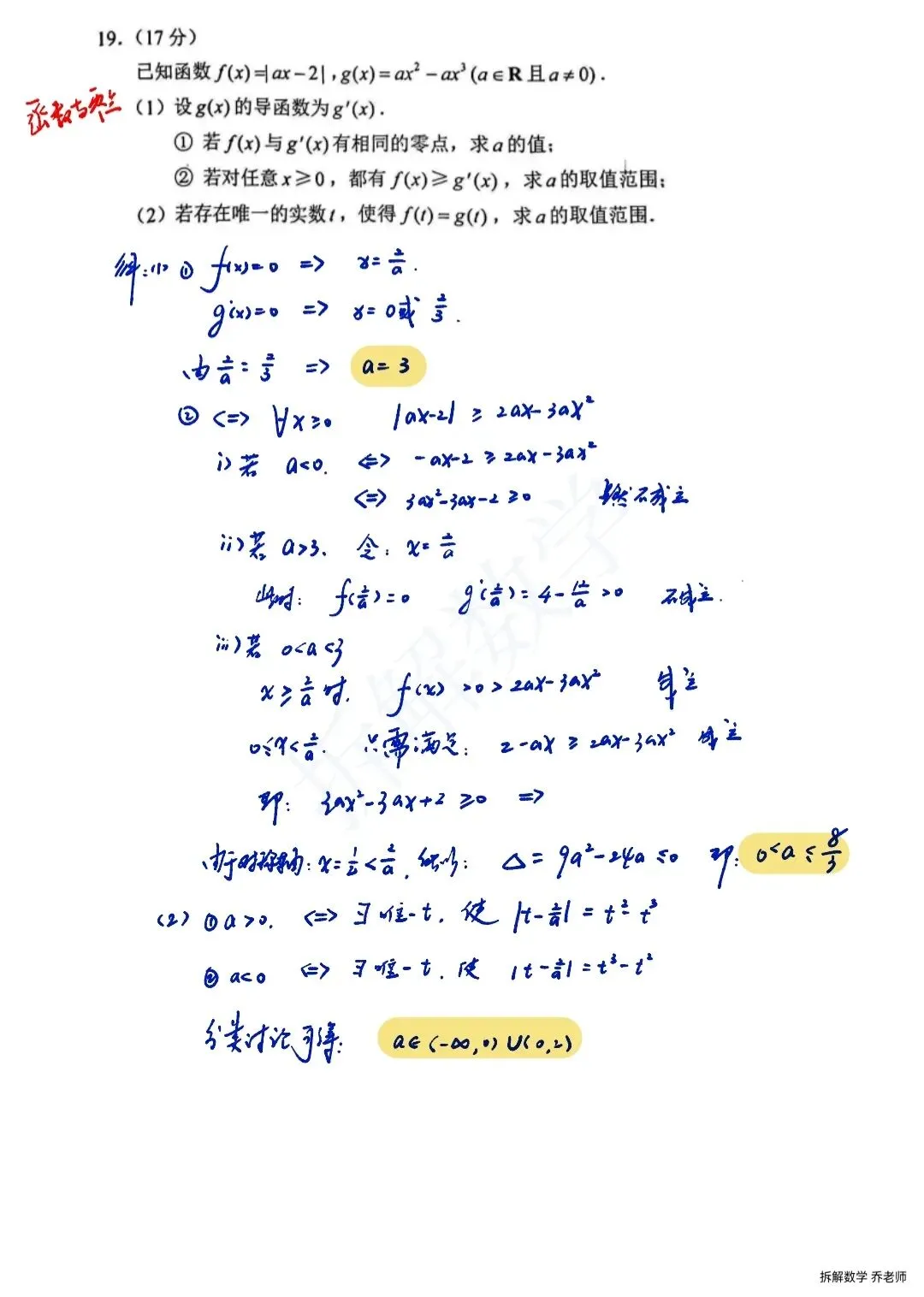 第19题,从形式上面看,非常具有天津高考填空压轴的特色。也像是高一函数压轴问题,若是高一学过导数工具,应该也能处理,但此类绝对值函数零点问题看似简单,处理起来非常麻烦,因为分类讨论不得当,可能一堆计算过程。事实上我们完全可以借助函数图像去分析,分类讨论的情形就会清晰很多。第三问也是如此,不过我们首先要处理的是将参数集中,虽然依然需要分两大类讨论,但思路上面会清晰许多。