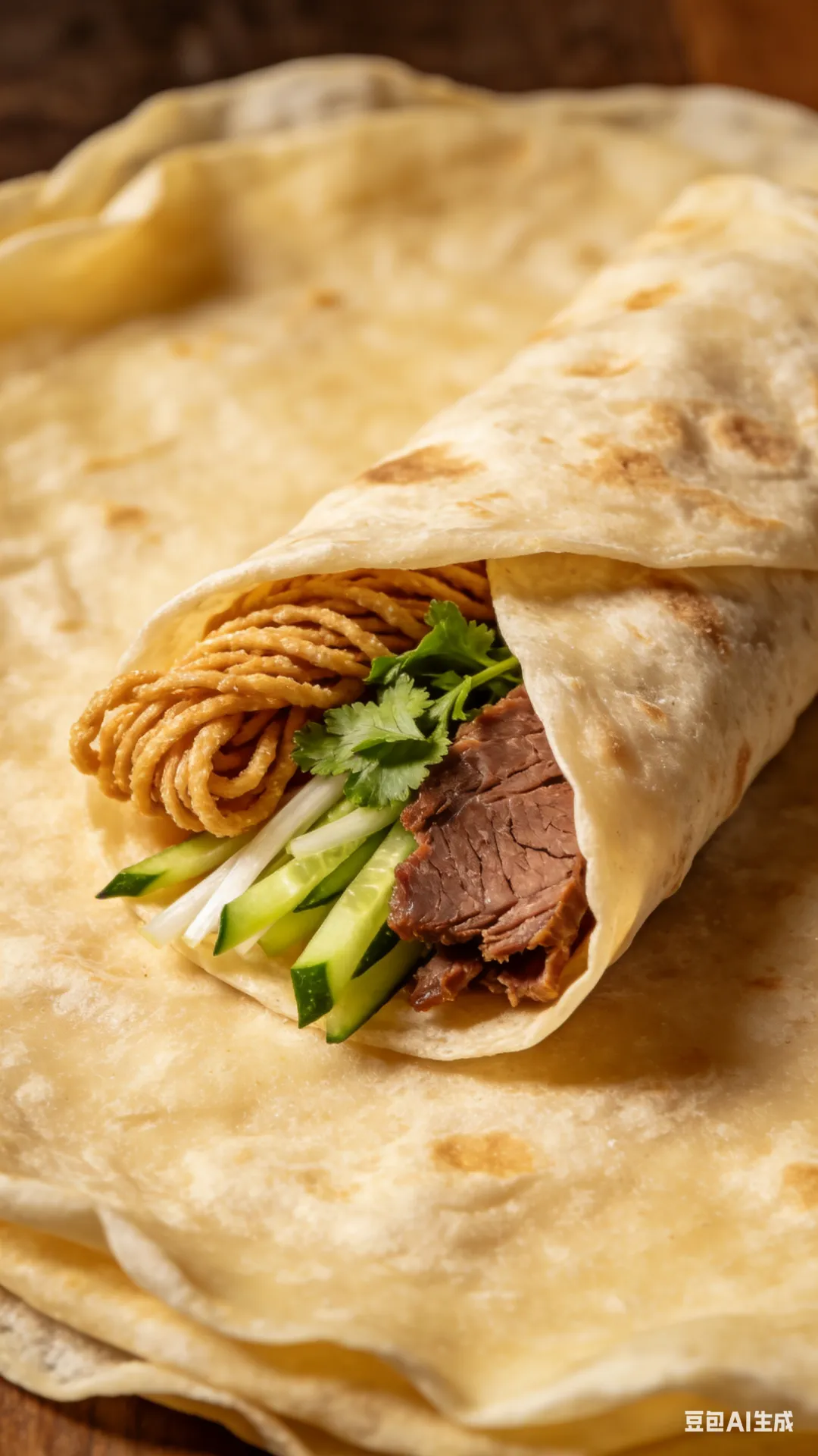 烙馍的魅力,在于它的包容性。春日鲜嫩的羊角蜜,清甜多汁,用烙馍一卷,咔嚓一口,满是春天的清甜。刚出锅的把子肉,肥瘦相间,肥而不腻,瘦而不柴,被烙馍紧紧包裹,肉香瞬间在口腔中散开。还有那爽口的馓子,酥脆的口感与烙馍的筋道相互交织,别有一番风味。