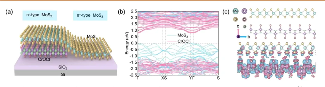 二维范德华同质结因晶格完美匹配、界面无散射中心而被视为高性能光电器件理想平台。然而在同一种材料内实现横向载流子浓度梯度通常需借助分栅、化学掺杂、光掺杂或铁电局域极化等复杂工艺,且需外部刺激维持,难以兼顾稳定性与可扩展性。界面耦合(interface coupling)通过邻近效应调控载流子浓度与能带结构,为“无掺杂”构建横向同质结提供新思路。CrOCl是一种层状vdW磁绝缘体(带隙≈2.8 eV),近期被报道可抽取MoS₂电子并诱导n→p型转变,但其用于横向同质结光伏与自驱动光电探测尚未探索。