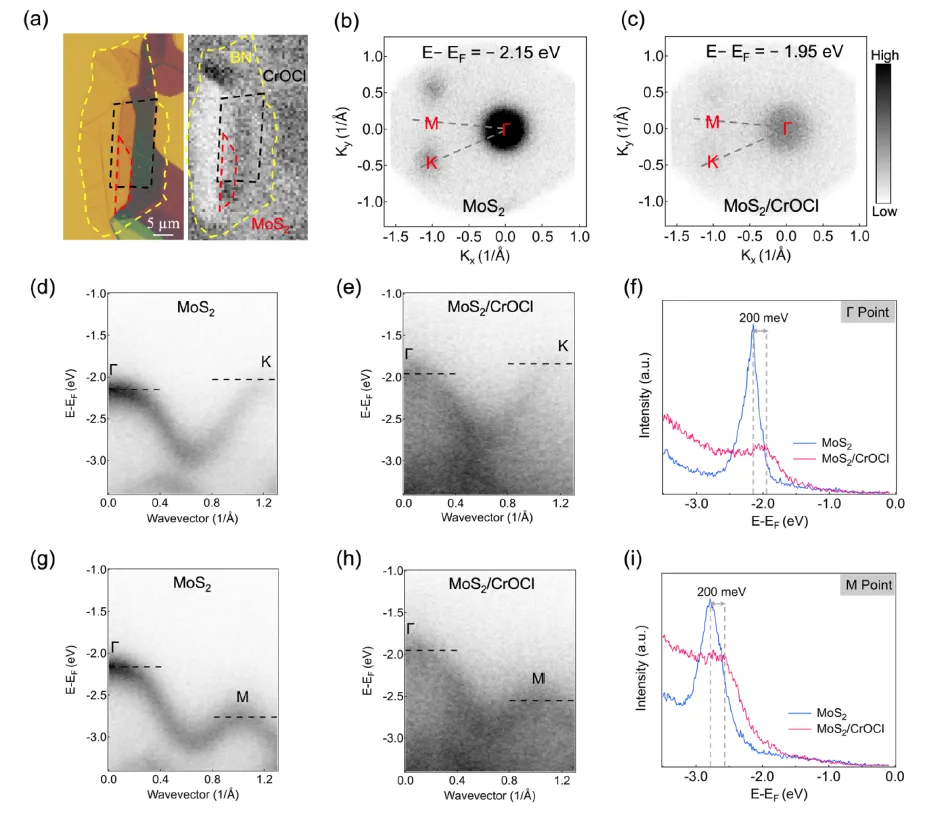 单层MoS₂与4.4 nm CrOCl、9 nm BN分别通过机械剥离获得,干法转移使用PC/PDMS印章:先在印章上拾取MoS₂,再对准下半部分与CrOCl/BN堆叠,形成横向n⁺–n⁻结构;上半部分MoS₂直接落在SiO₂/Si衬底。整个堆叠在180 °C轻压下释放,氯仿去除PC胶。微区ARPES在意大利Elettra光源Spectromicroscopy束线完成,光子能量74 eV,光斑600 nm,能量分辨率45 meV,样品在UHV中350 °C退火10 h以清洁表面。器件电极由电子束曝光写出,Cr/Au蒸发后剥离形成源-漏间距3 µm、宽度10 µm的非对称电极。
