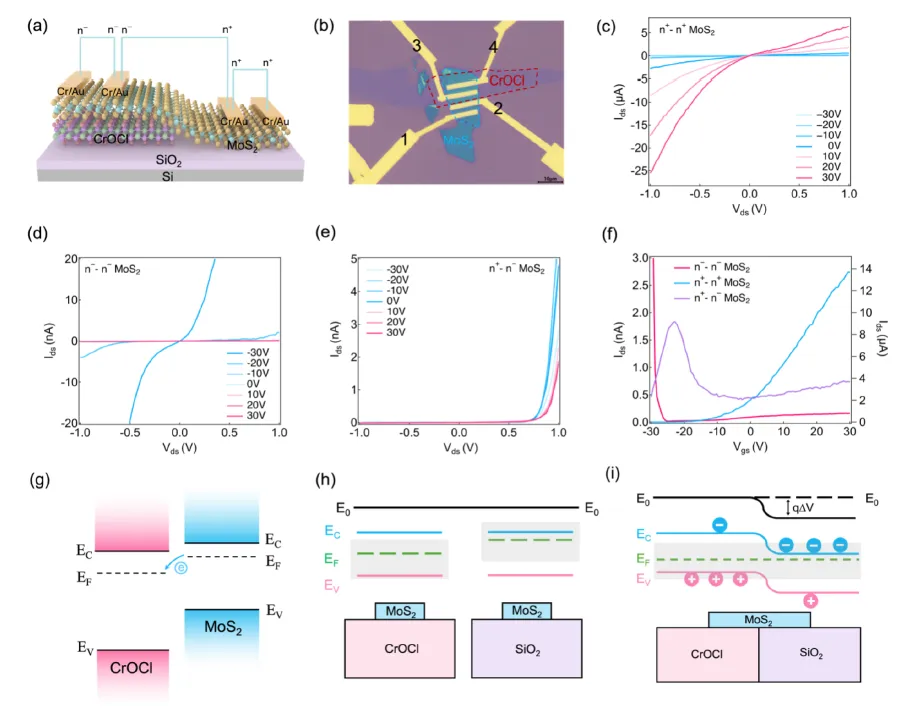首次利用vdW绝缘体CrOCl与MoS₂的界面电荷转移,在同一MoS₂晶片内构建横向n⁺–n⁻同质结,无需化学掺杂、栅极或铁电层,工艺简单且空气稳定。