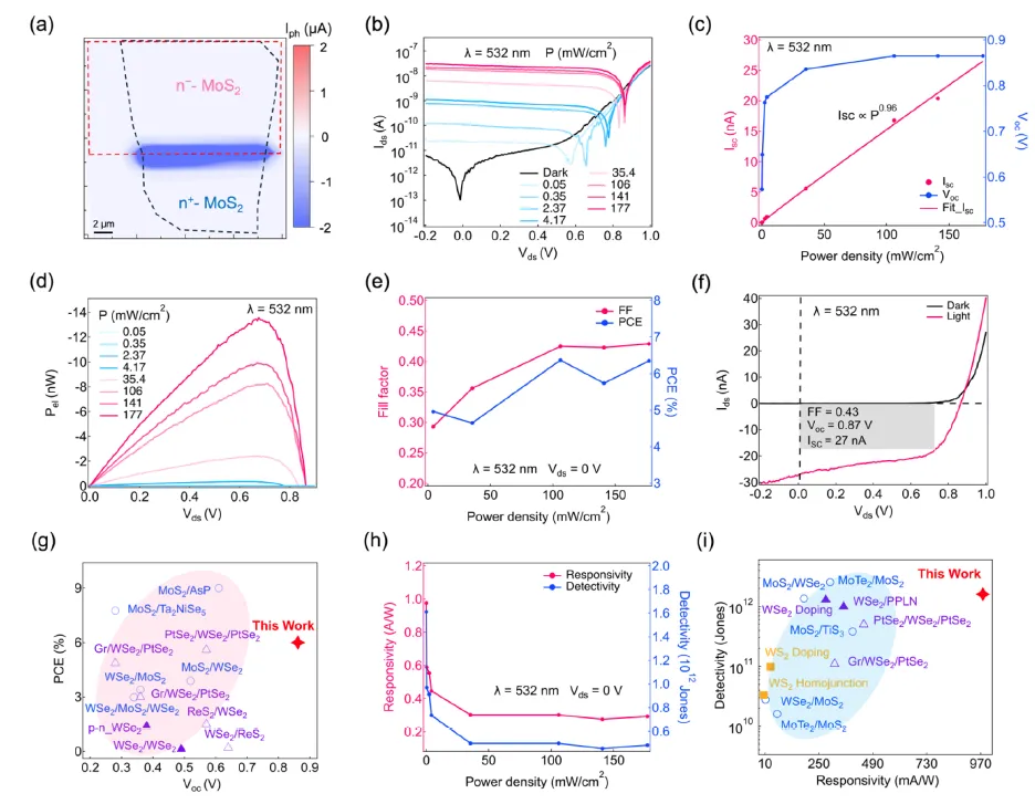 同质结在零偏压下实现0.87 V开路电压与6.35 %光伏效率,均为TMD同质结报道最高值;自驱动探测响应度近1 A W⁻¹,比探测率>10¹² Jones,兼具高速(µs级)与长寿命(>30天)。