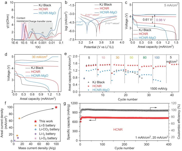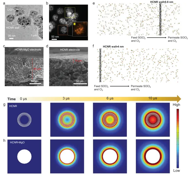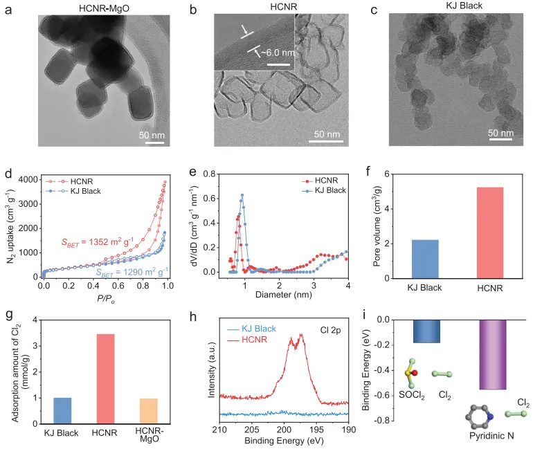 可充电锂-氯电池是一种前景广阔的高能量密度技术。然而,传统正极材料的开孔结构允许Cl₂不受控制地扩散到电解质中,这带来了一个根本性挑战,导致严重的局部浓度稀释,从而影响了倍率性能和比容量。2026年2月3日,苏州大学Yan Xu、严锋、中国科学技术大学陈维、奥斯特拉发技术大学Mark H. Rummel在国际知名期刊Advanced Materials发表题为《Self-Confinement Effect Enabled by Hollow Carbon Nanoreactor for High-Performance Li–Cl2 Battery》的研究论文,Yan Xu、Shenxiang Zhang为论文共同第一作者,Yan Xu、严锋、陈维、Mark H. Rummel为论文共同通讯作者。在此,作者提出了一种利用中空碳纳米反应器(HCNRs)的自分子限制策略,通过其壁上的微孔(约0.8 nm)来调控活性Cl₂物种的局部浓度。这些微孔充当尺寸选择性屏障,阻止了尺寸较大的活性Cl₂物种(动力学直径约0.86 nm)的逸出,而介孔(30–50 nm)则作为纳米反应器富集活性Cl₂物种。这种设计使组装的Li─Cl₂电池在充放电过程中能够实现100 mA cm⁻²的超高电流密度和创纪录的8000 mAh g⁻¹(9 mAh cm⁻²)的比容量,优于已报道的文献。这种中空纳米反应器设计凸显了Li─Cl₂电池作为高功率和高能量密度系统的潜力,为其商业化应用铺平了道路。随着电动汽车和电动飞机需求的不断增长,高能量密度电池的研发日益受到重视。锂离子电池(LIBs)是目前最理想的选择,其能量密度约为250 Wh kg⁻¹。然而,为了延长这些应用场景的续航里程,迫切需要进一步的技术进步。近年来,使用亚硫酰氯(SOCl₂)作为电解质、金属锂作为负极、多孔材料作为正极的可充电锂-氯(Li─Cl₂)电池因其高理论能量密度而备受关注。尽管前景广阔,但这些Li─Cl₂电池系统仍面临着阻碍其实际应用的重大技术障碍。正极材料通常具有开孔结构。这种结构特征使得在电池运行期间,活性Cl₂物种会不受控制地扩散。Cl₂在SOCl₂电解质中的高溶解度使得情况变得更加复杂,导致了可溶性Cl₂络合物的形成。这种开孔结构极大地稀释了正极材料附近的局部Cl₂浓度。这可能导致缓慢的反应动力学和低比容量。此外,逸出的Cl₂导致LiCl优先在隔膜附近沉积,使得正极内部区域缺乏反应物。这可能导致正极的过早失效和有限的比容量。Butler-Volmer方程明确地将反应动力学(j)与正极表面的反应物表面浓度(Cso)关联起来,该方程表明,提高正极-电解质界面处的局部Cl₂浓度可以直接提高反应动力学。因此,作者假设在正极结构内对Cl₂物种进行空间限制可以显著改善电化学性能。中空碳纳米结构在气体储存和离子调控方面已展示出卓越的能力,但其用于分子筛的孔壁工程在Li─Cl₂电池中尚未被探索。作者提出在空心碳壁上设计纳米孔作为分子门,通过尺寸筛分效应将持续生成的-[SOCl₂···Cl₂]n-络合物限制在空腔内。在此,作者提出一种自分子限制策略,使用壁上具有精确设计的亚纳米级纳米孔的N掺杂中空碳纳米反应器(HCNRs),以将-[SOCl₂···Cl₂]n-络合物富集在空腔内。这些纳米孔作为分子筛,允许Li⁺/Cl⁻快速传输,同时物理上阻止了尺寸较大的-[SOCl₂···Cl₂]n-络合物(动力学直径约0.86 nm)的逸出。被限制的-[SOCl₂···Cl₂]n-络合物在介孔中创造了一个局部富集Cl₂的环境,这使得电池能够同时具备超高倍率性能和卓越的容量。所得的Li─Cl₂电池实现了100 mA cm⁻²的电流密度和8000 mAh g⁻¹的容量——这优于所有已报道的数值。值得注意的是,使用HCNRs作为正极材料的Li─Cl₂软包电池在全电池层面展现出约106 Wh kg⁻¹的实际能量密度。作者的研究结果表明,这种中空正极材料设计在解决Li─Cl₂电池能量密度和功率密度之间的权衡问题上具有巨大潜力。本研究提出了一种具有自分子限制效应的中空碳纳米反应器(HCNR)作为Li-Cl₂电池正极,通过其壁上的微孔限制活性Cl₂物种的扩散,从而显著提升了电池的反应动力学、倍率性能和比容量。该研究实现了创纪录的超高电流密度和比容量,并成功验证了软包电池的实际应用潜力,为开发兼具高能量密度和高功率密度的新型储能系统提供了新思路。图1:空心碳纳米反应器(HCNR)的自限域策略设计原理。 (a) 传统商业化碳正极材料(KJ Black)的开放孔隙结构导致Cl₂物种在电解液中无限制扩散,造成局部浓度稀释;(b) HCNR电极通过壁上的微孔(≈0.8 nm)作为尺寸选择性屏障阻挡较大的-[SOCl₂···Cl₂]ₙ复合物(动力学直径≈0.86 nm),同时利用30-50 nm的中空介孔作为纳米反应器富集活性Cl₂物种,实现自限域效应。图2:HCNR的制备与表征。 (a) 未刻蚀MgO模板的HCNR-MgO透射电镜(TEM)图像,显示立方MgO核心外包覆碳层;(b) 刻蚀后HCNR的TEM图像,清晰显示中空结构,插图高分辨TEM显示壁厚约6.0 nm;(c) 商业化KJ Black的TEM图像,显示开放孔隙结构;(d) 77 K下N₂吸脱附等温线,HCNR和KJ Black均呈现典型的II型曲线,HCNR的BET比表面积为1352 m² g⁻¹;(e) 非局部密度泛函理论(NLDFT)孔径分布曲线,微孔集中在0.7-1.0 nm范围;(f) HCNR的总孔容(5.232 cm³ g⁻¹)显著高于KJ Black(2.21 cm³ g⁻¹),归因于中空介孔贡献;(g) Cl₂静态吸附实验,HCNR的Cl₂吸附量(3.5 mmol g⁻¹)远高于HCNR-MgO(0.96 mmol g⁻¹)和KJ Black(1 mmol g⁻¹);(h) Cl₂吸附后的XPS Cl 2p谱,HCNR检测到明显Cl信号而KJ Black无信号;(i) DFT计算的吸附能,吡啶氮与Cl₂的结合能为-0.55 eV,SOCl₂与Cl₂的相互作用能为-0.18 eV。图3:Li-Cl₂电池的电化学性能。 (a) 电化学阻抗谱(EIS)的弛豫