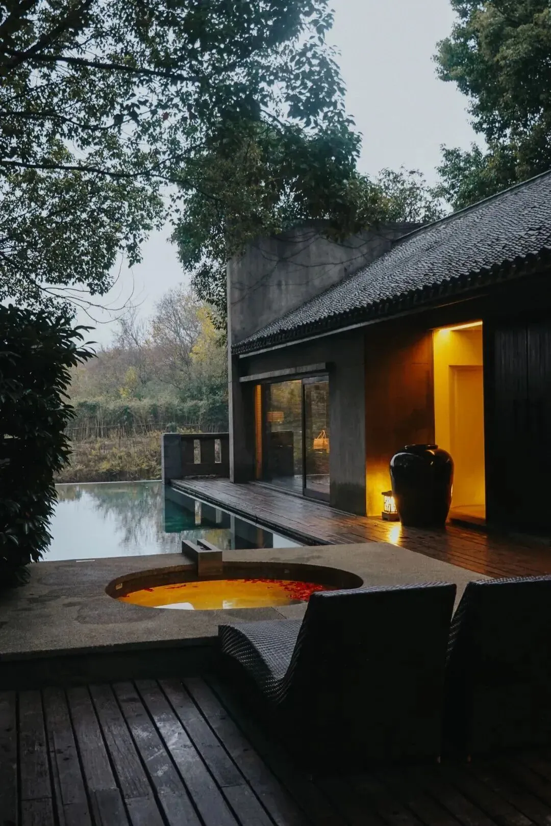 位于江苏园博园内的悦榕庄,设计感极强,是南京近年来的顶流酒店。大部分客房都配有私人温泉泡池,还可以直面山谷美景。