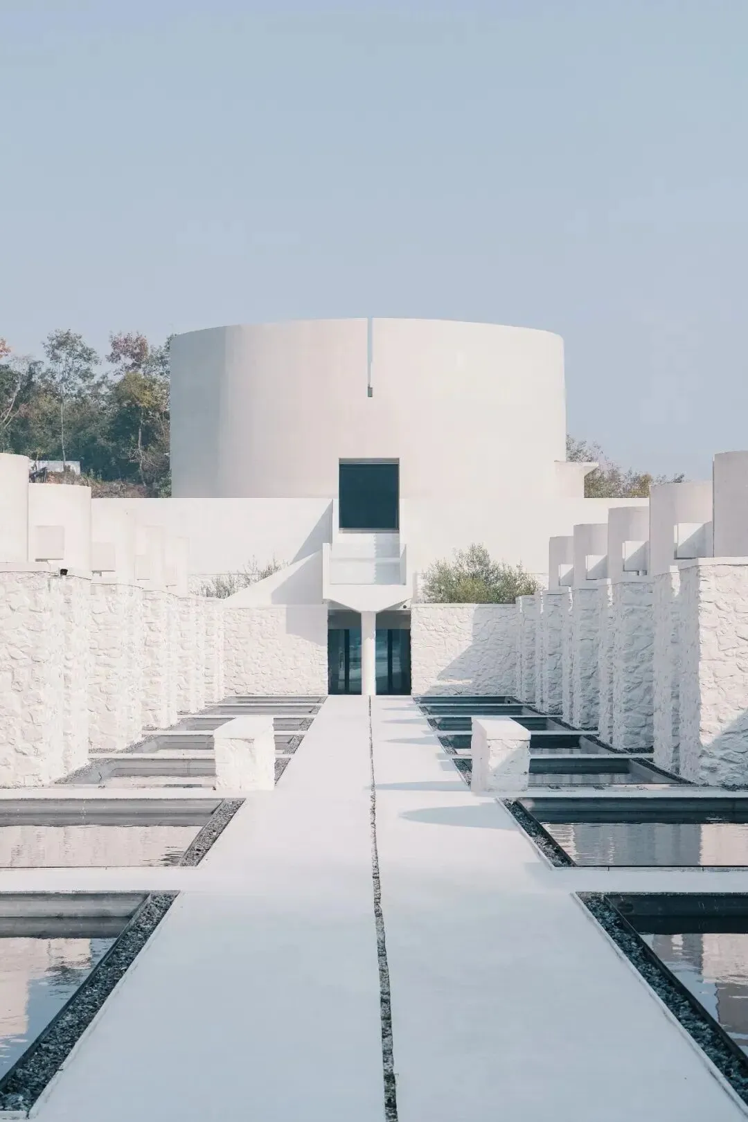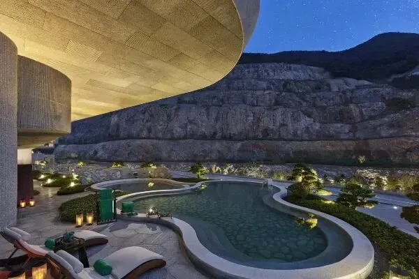 汤山元博纪温泉酒店是一家极具未来感和设计感的精品设计酒店。酒店由多个几何形态的“盒子”组成,仿佛一座建在山谷中的现代艺术馆,非常出片。