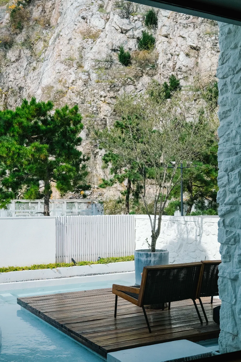 酒店的最大亮点是所有客房均为别墅形制,且每间都引天然温泉入户,配有私享温泉泡池。部分泡池直接设置在庭院中,私密性绝佳。