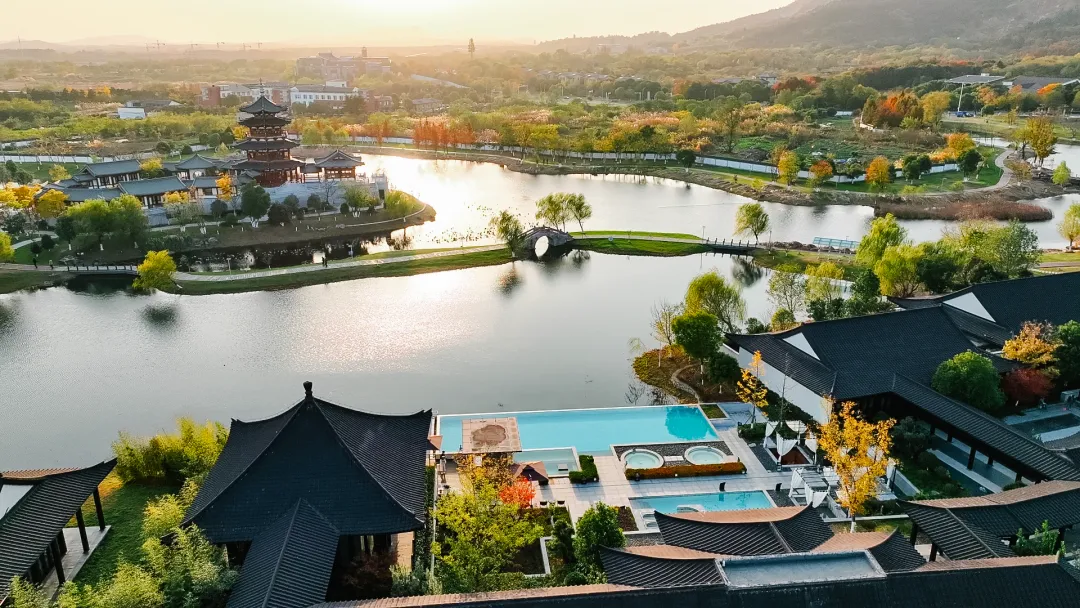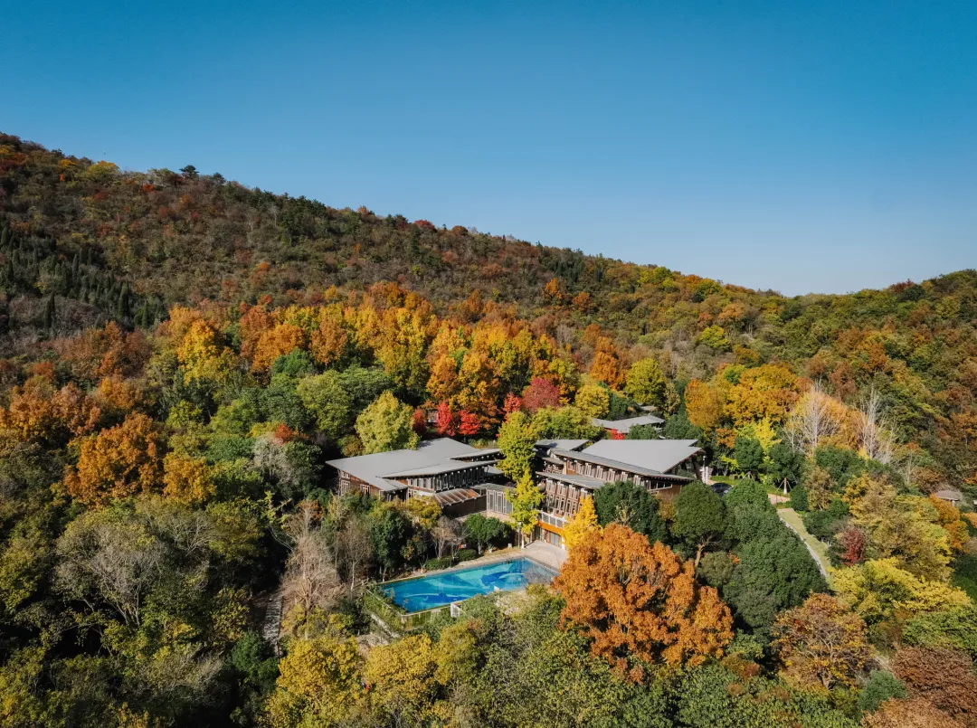 南京汤山温泉文化中心坐落于汤山温泉旅游度假区的山腰,从航拍视角俯瞰,只见酒店大大小小的建筑藏于五彩斑斓的山脉中,唯美至极。