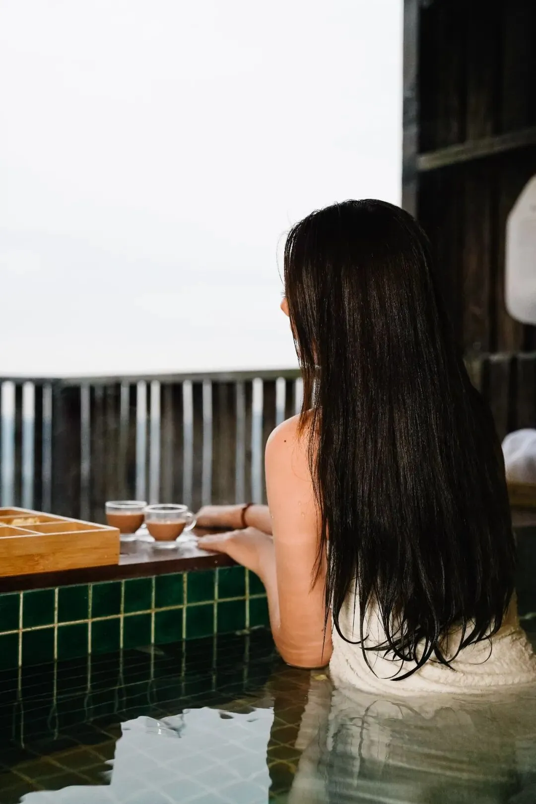 除了私汤房,酒店也有两座露天温泉泡池,以及九座枕着山坡藏在丛林中的野池,你可以按需选择。