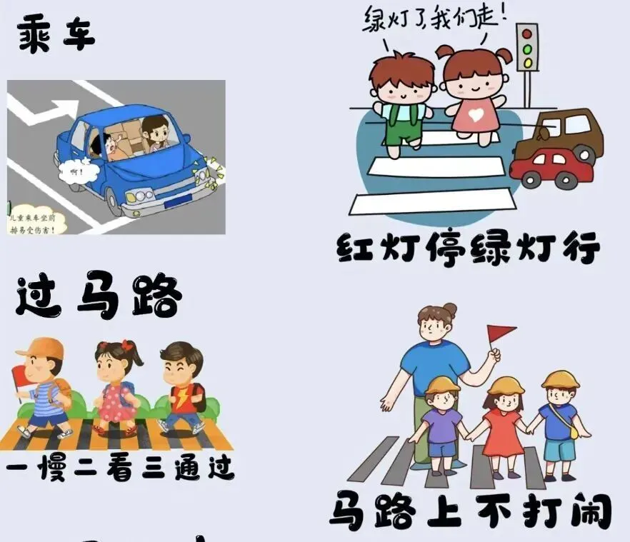 1. 提醒孩子不在马路上玩耍、奔跑、打闹,过马路要走斑马线、人行天桥等,遵守交通规则,看红绿灯指示通行。