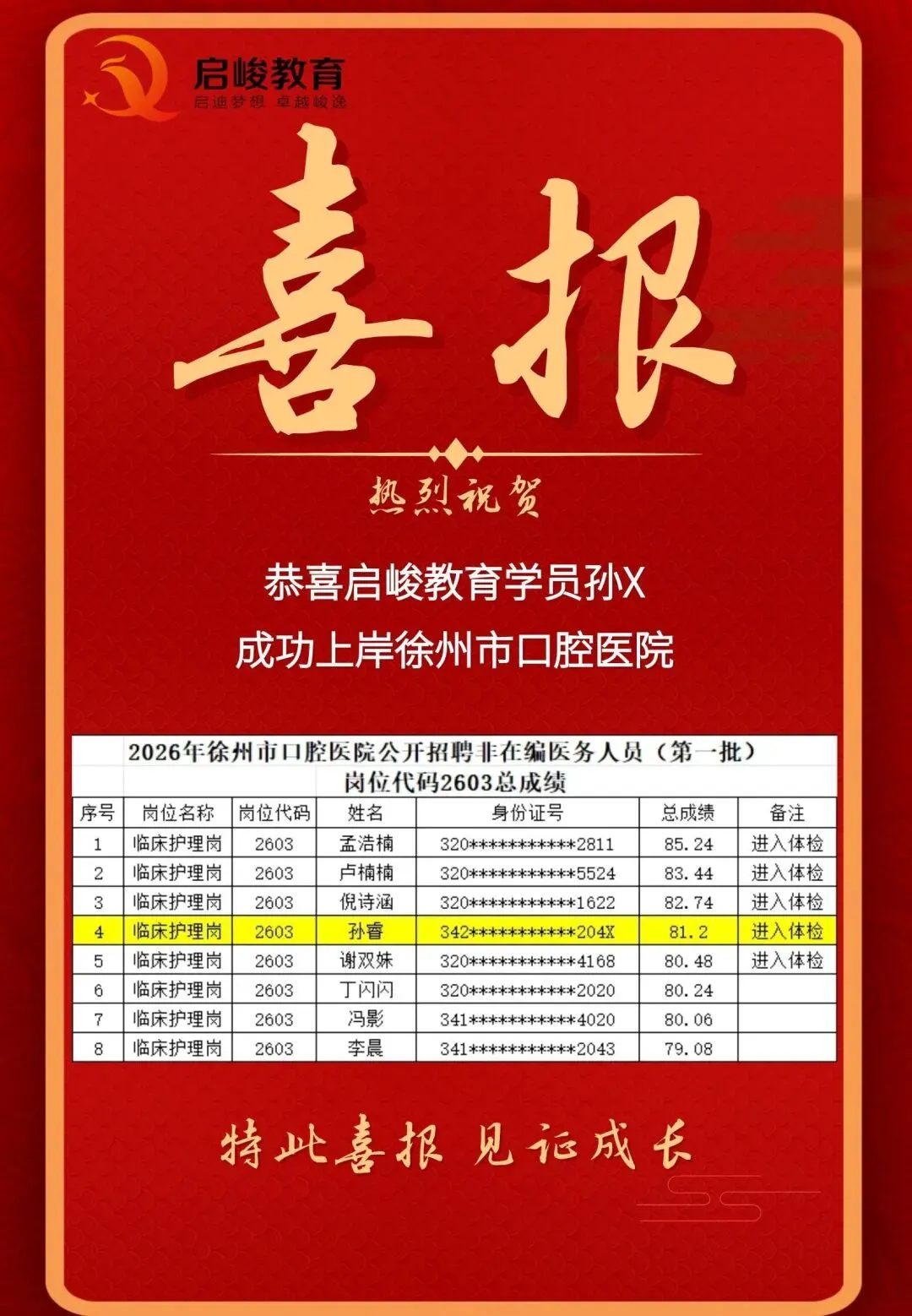 春风送喜,捷报频传!在刚刚结束的2026年徐州市口腔医院公开招聘非在编医务人员(第一批)考试中,启峻教育一批优秀学员脱颖而出,顺利通过笔试、面试,进入体检环节,成功“上岸”!这不仅是学员们辛勤付出的回报,更是启峻教育专业教学与精准辅导成果的有力见证!
