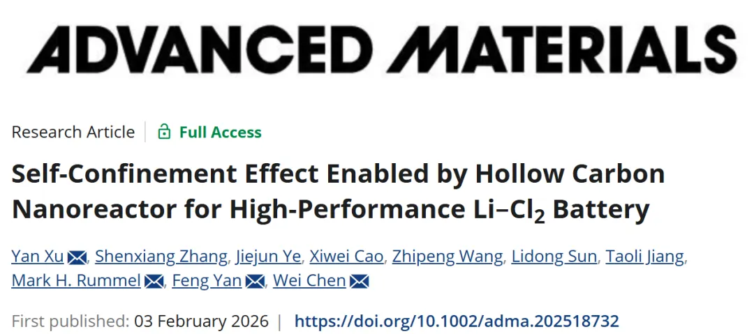 Self‐Confinement Effect Enabled by Hollow Carbon Nanoreactor for High‐Performance Li–Cl 2 Battery. Yan Xu;Shenxiang Zhang;Jiejun Ye;Xiwei Cao;Zhipeng Wang;Lidong Sun;Taoli Jiang;Mark H Rummel;Feng Yan;Wei Chen. ISSN: 0935-9648 , 1521-4095; DOI: 10.1002/adma.202518732. Advanced materials , 2026.