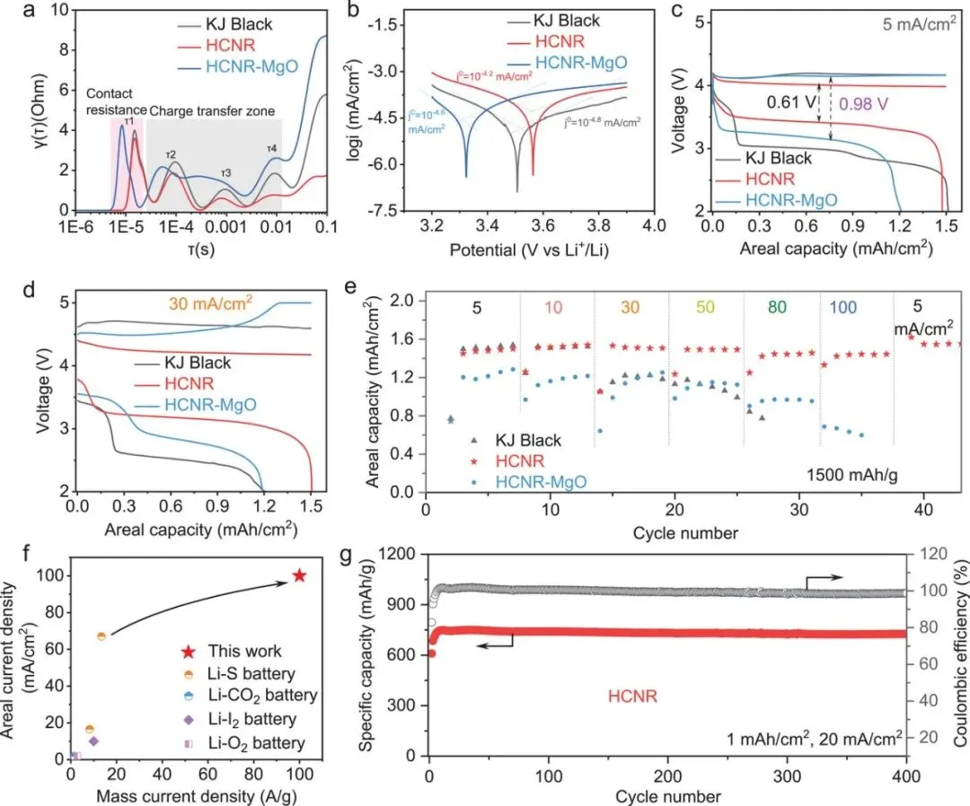 电化学阻抗谱(EIS)与弛豫时间分布(DRT)分析表明,HCNR正极具有更低的电荷转移阻抗与离子扩散阻力。Tafel曲线显示其交换电流密度最高(10⁻⁴.² mA cm⁻²),表明反应动力学显著增强。在5–100 mA cm⁻²的电流范围内,Li-Cl₂@HCNR电池表现出较高的放电平台(3.41 V@5 mA cm⁻²)与优异的倍率耐受性,即使在100 mA cm⁻²下仍能保持稳定循环,库伦效率≈95%。