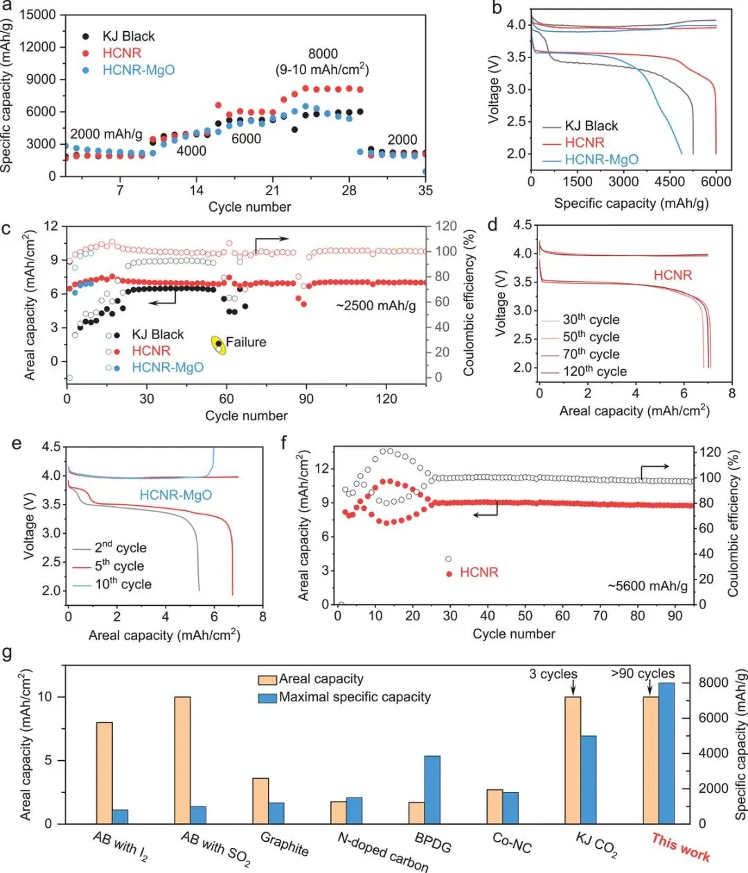 在2000–8000 mAh g⁻¹的高比容量范围内,Li-Cl₂@HCNR电池的库伦效率始终接近100%,而HCNR-MgO与KJ Black在≥6000 mAh g⁻¹时效率显著下降。HCNR正极在面容量7–9 mAh cm⁻²下仍能保持长循环稳定性(>90圈),凸显其优异的限域效应与结构稳定性。