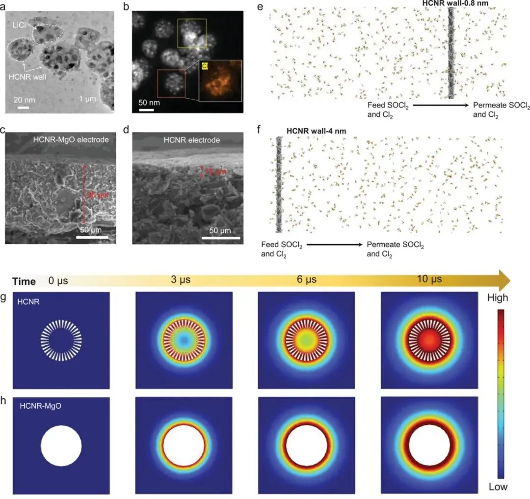 TEM-EDS显示放电后LiCl主要沉积在HCNR腔体内,而非外表面,证实Cl₂-SOCl₂复合物在腔体内的富集。截面SEM显示HCNR-MgO电极表面形成厚LiCl层(≈90 μm),而HCNR电极仅15 μm,说明中空结构有效抑制了表面堵塞。分子动力学模拟进一步表明,0.8 nm微孔可有效阻挡Cl₂-SOCl₂复合物穿透,而4 nm孔则无法实现限域,从理论上验证了尺寸选择屏障的作用机制。