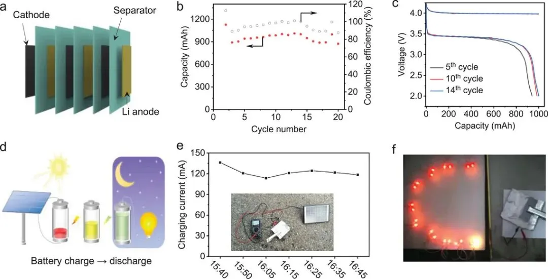 研究构建了多层结构的Ah级软包电池(正极面积20.4 cm²),其首圈放电容量达3400 mAh,全电池能量密度约350 Wh kg⁻¹。电池在20圈循环中保持稳定,放电电压约3.42 V。此外,通过光伏板(6 W, 9 V)充电后,软包电池可持续点亮一系列LED灯,展示了其在可再生能源存储中的应用潜力。