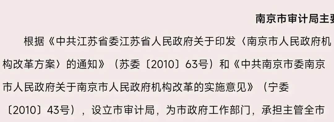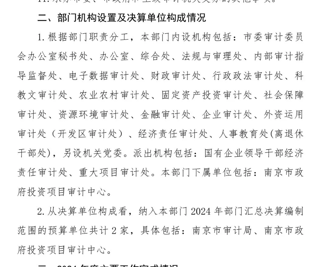 南京市审计局内设有市委审计委员会办公室秘书处、办公室、综合处、法规与审理处、内部审计指导监督处、电子数据审计处、财政审计处等处室,
