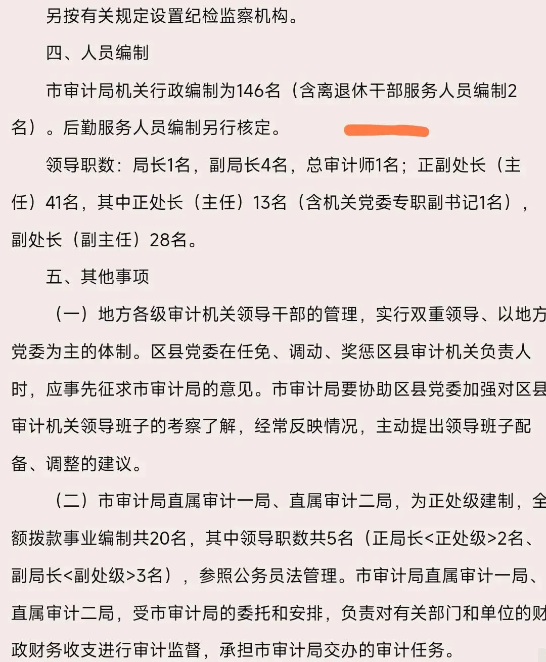 根据三定方案,南京市审计局有行政编制146名,设局长1名,副局长4名,总审计师1名,正处级领导职数13名,副处级领导职数28名,